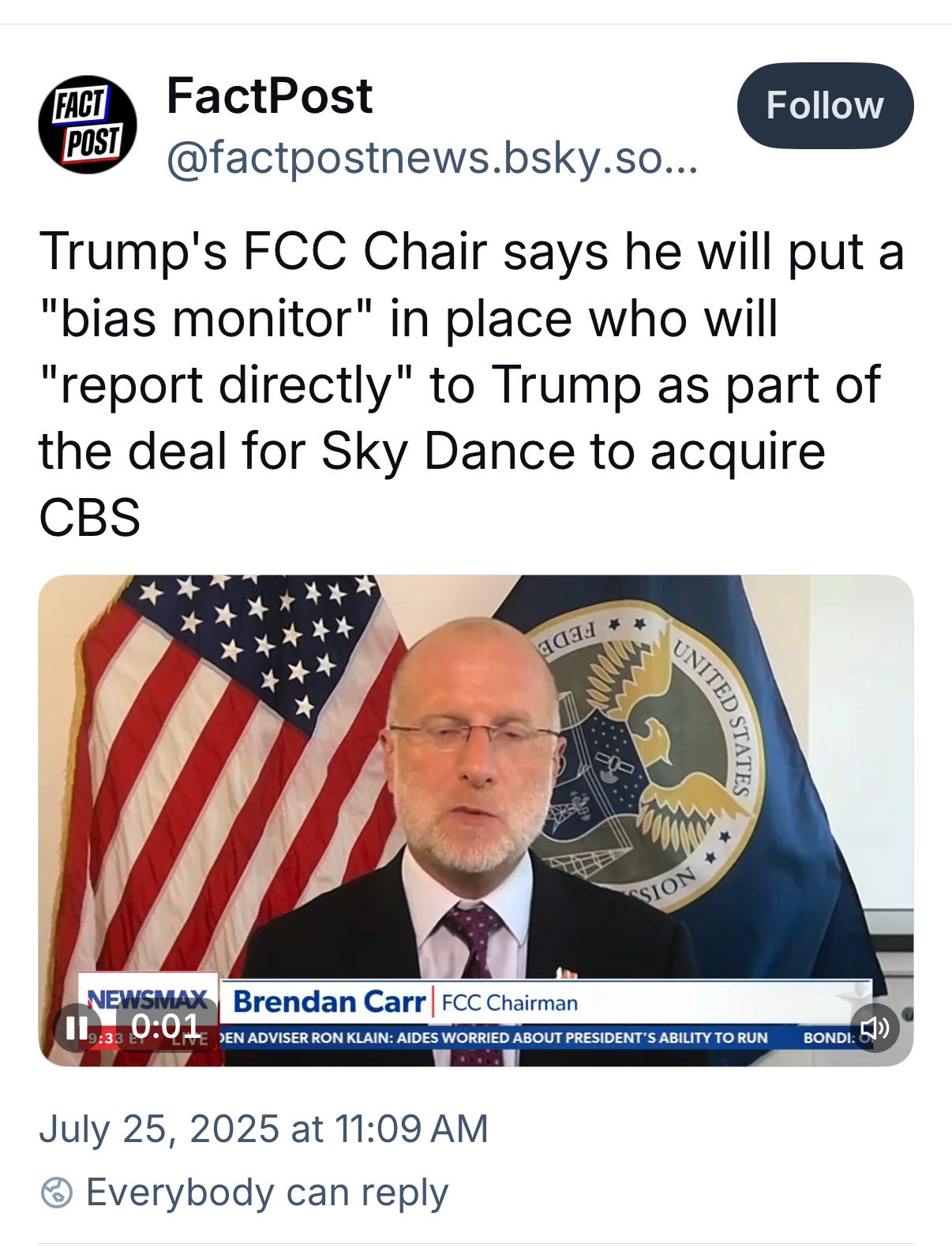 The designation of a censor/ombudsman followed Trump’s ridiculous lawsuit about how a 60 Minutes interview with Kamala Harris was edited. That’s the lawsuit CBS’s parent company, Paramount, agreed to pay Trump $16 million to resolve, despite the fact that most legal experts who had assessed it thought it was a loser. When the fourth branch of government, the free press, bends the knee like that, it’s time to reread 1984.