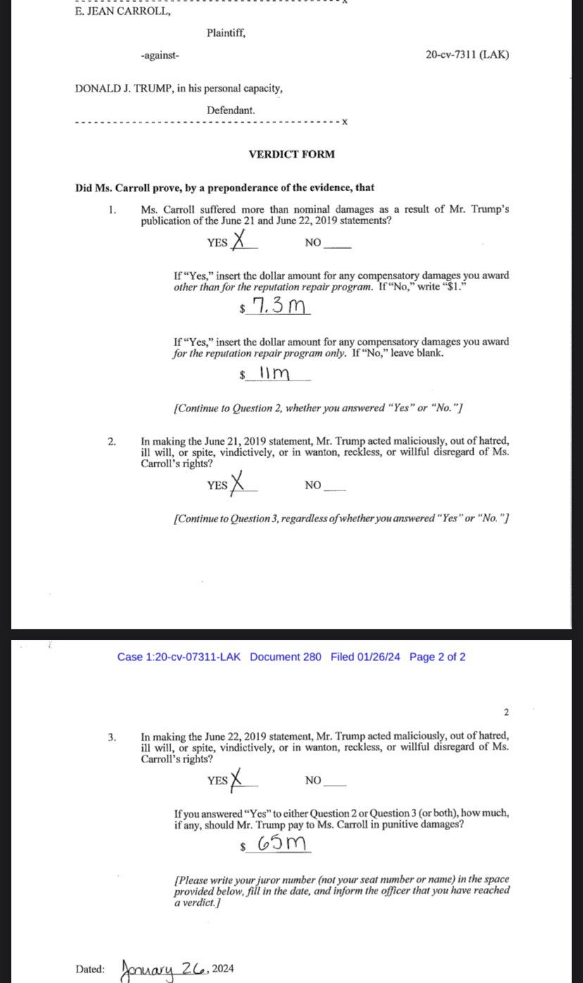 First off, the verdict by the numbers. The jury awarded E. Jean Carroll two items of compensatory damages: $7.3 million for pain and anguish and $11 million for reputation repair. After finding that the statements Trump made about Carroll on two separate occasions in June of 2019 were made with malice, they added on $65 million in punitive damages.