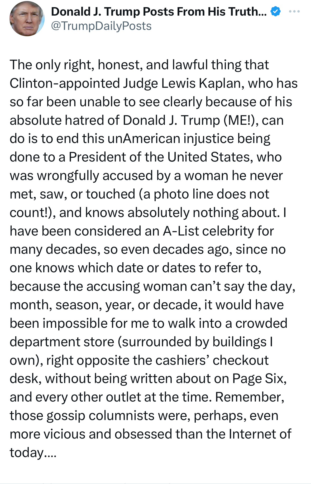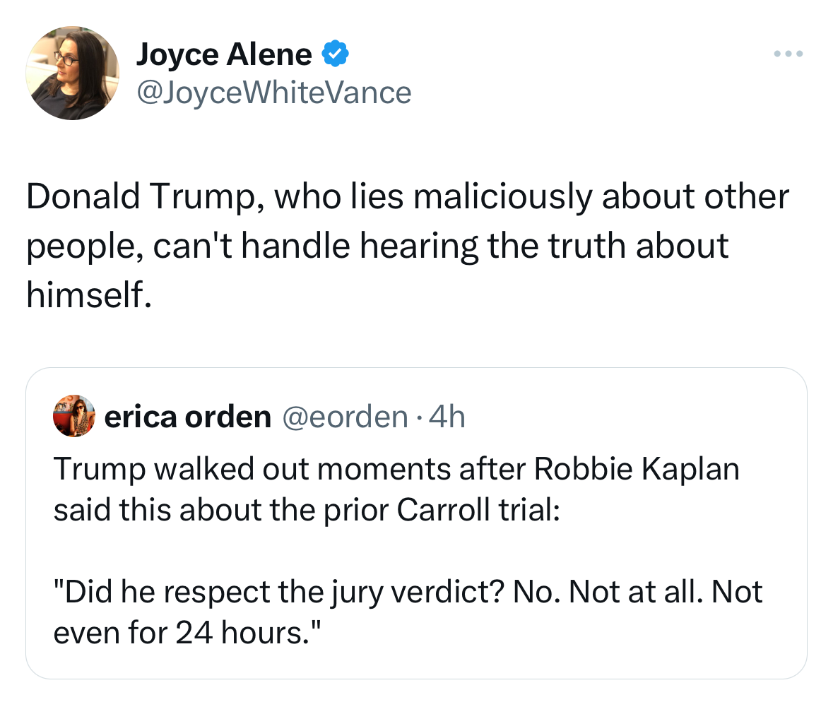 Donald Trump was arguing for “jury nullification,” that no matter what the judge instructed them, the jury should reject the finding in the earlier trial—that Trump had sexually assaulted Carroll and lied about it—and that they should refuse to grant her damages in a significant amount. So the Judge, in a low-key way that certainly doesn’t rise to the level of reversible error but is nonetheless out of the ordinary, reinforced the importance of the court system and its integrity in the minds of the jurors before they deliberated. That is a reasonable counterbalance to the chaos Trump tries to insert into judicial proceedings and was perhaps the final element of Judge Kaplan’s careful control of his courtroom, which prevented a dissent into theatrics and prevented the trial from becoming just another campaign venue.