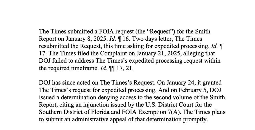 The New York Times is trying to get DOJ to release Volume 2 of Jack Smith’s report, the one about the Mar-a-Lago classified documents case. So far, DOJ has refused. The Times is appealing the decision administratively, inside of DOJ, but they’ve filed a lawsuit as well, in the likely event DOJ refuses to release Volume 2.