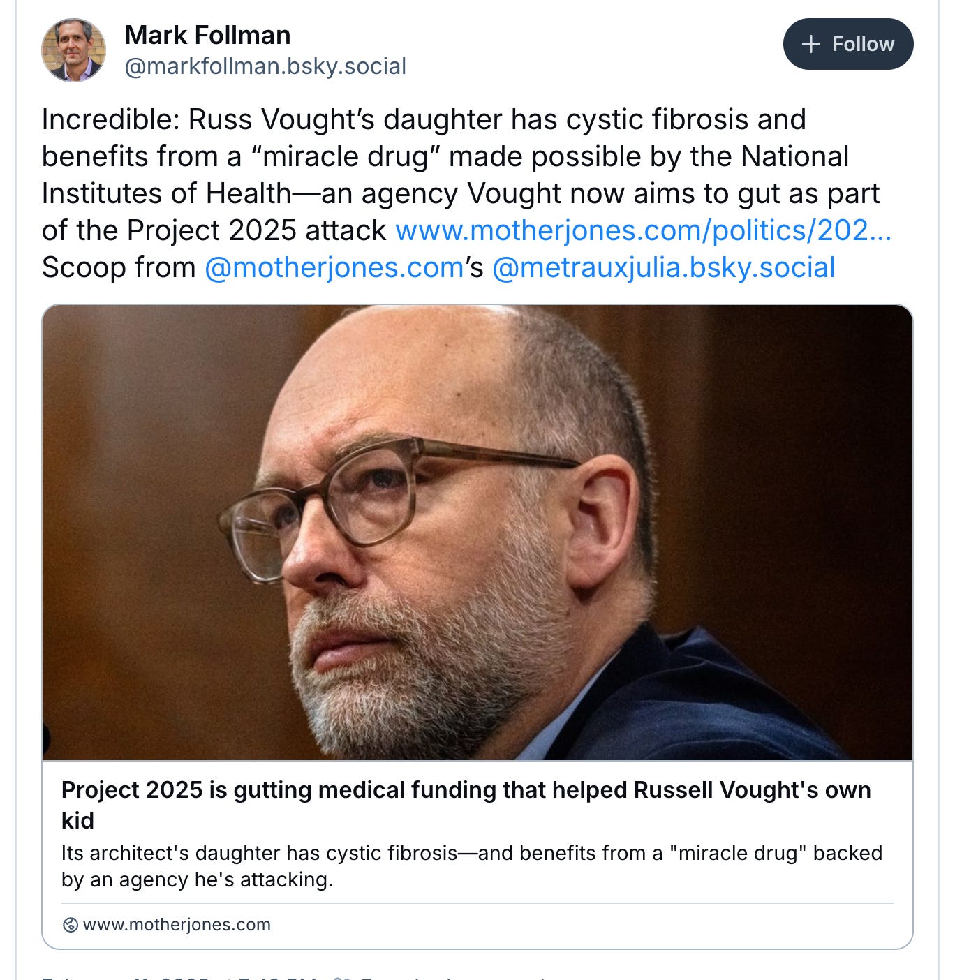 Russ Vought, folks. He’s one of the architects of Project 2025, which calls for NIH to be gutted. Now, as the head of OMB he’ll be involved in the plan to devastate research sponsored by the agency, even though his own kid, who has cystic fibrosis, benefits from one of the “miracle drugs” its research has made possible.
