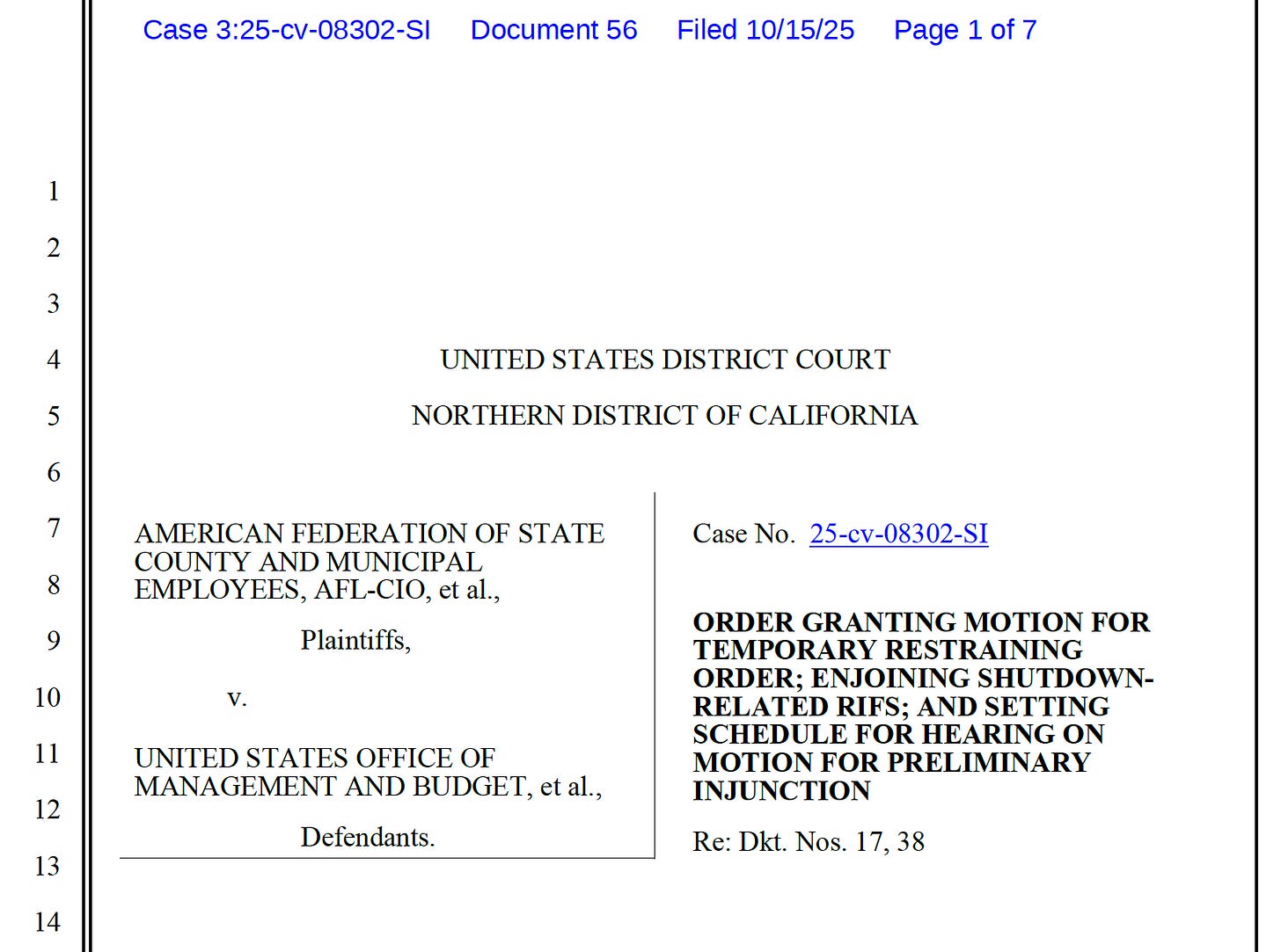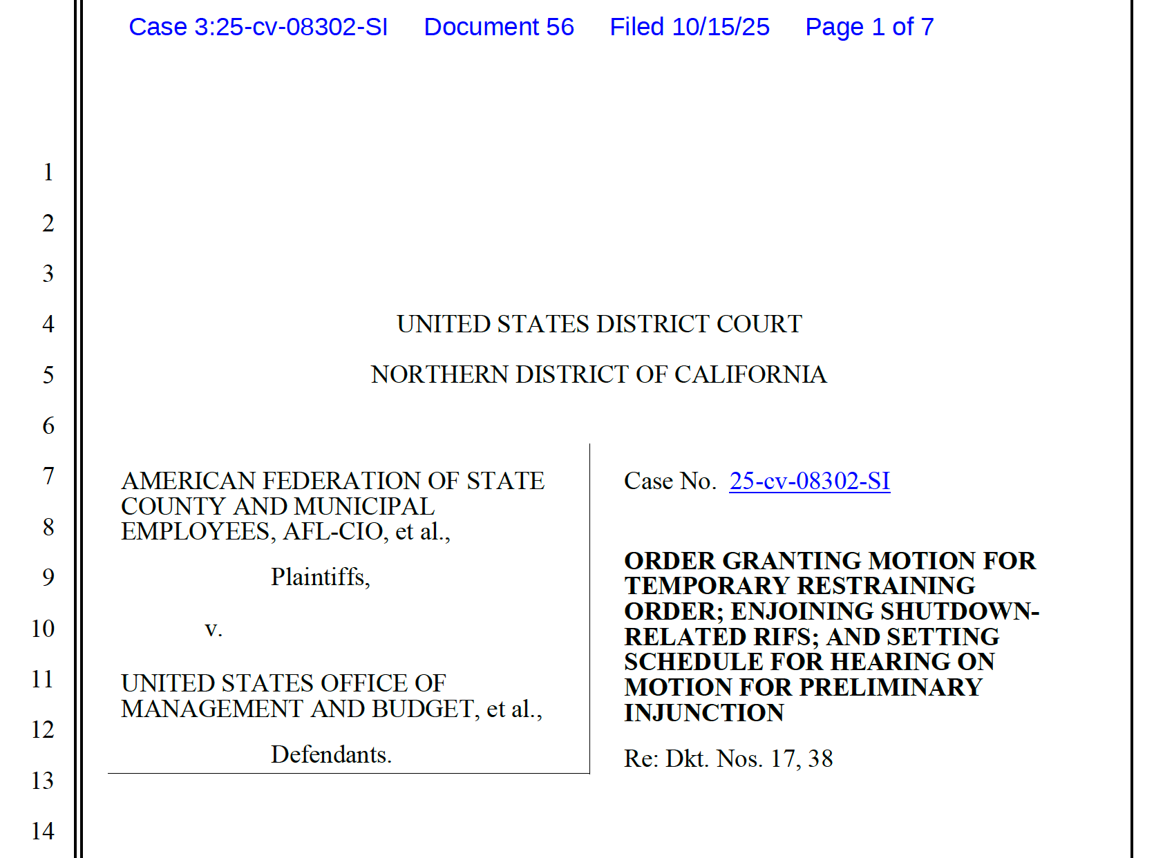 Today, a federal judge granted a motion for a temporary restraining order, enjoining the government from firing employees during the shutdown. The injunction was entered in a case filed by unions: the American Federation of State, County, and Municipal Employees (AFSCME), the AFL-CIO, and others, against the Office of Management and Budget, the Office of Personnel Management, and other federal agencies involved in the employee terminations.