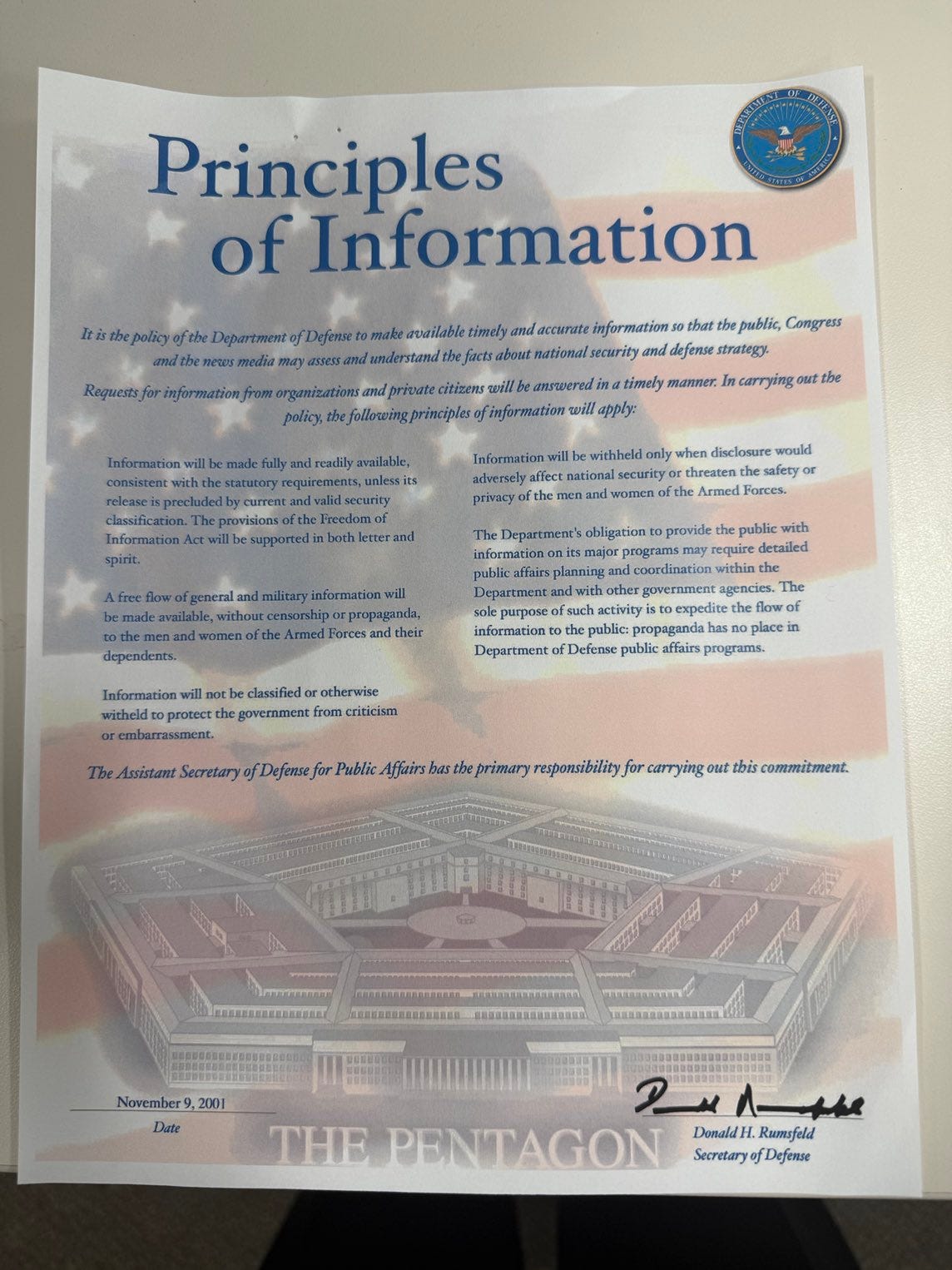 Journalist Nancy Youssef posted an item she said was found while the press corps was cleaning out. Signed in the wake of 9/11. “Information will be made fully and readily available,” it reads. “Information will not be classified or otherwise withheld to protect the government from criticism or embarrassment.”