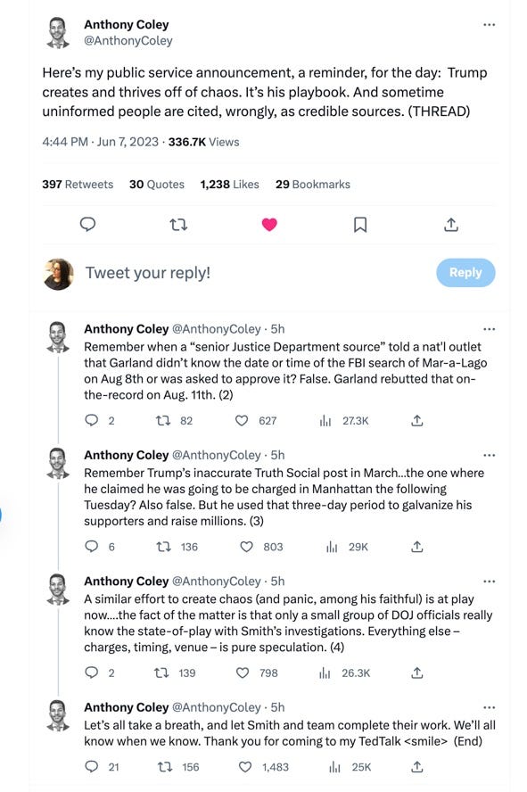 I’ll be up with the chickens tomorrow (actually, I’m up with the chickens every day, but you get the point), watching as news develops from Miami and Washington, D.C. But I want to leave you with an extremely smart thread by former DOJ spokesperson, Anthony Coley, on Twitter.