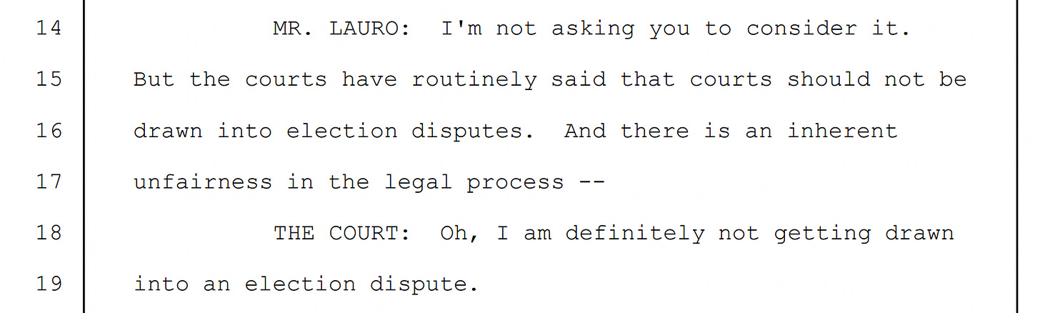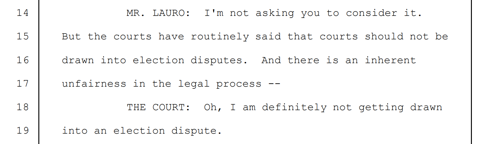 In back and forth with the lawyers over how to proceed, Lauro told her that as he read the indictment, the Supreme Court required them to deal with immunity “forthwith.” “Under your schedule, we wouldn’t even begin briefing immunity until December,” Judge Chutkan said. “Why?” When Lauro tried to appeal to the need to keep sensitive material out of public view before the election, the response was a sharp one. “This Court is not concerned with the electoral schedule,” she said. “Yes, there's an election coming. But the sensitive time that you're talking about, if you're talking about the timing of legal issues and the timing of evidentiary issues in relation to when the election is, that's not -- that's nothing I'm going to consider.”