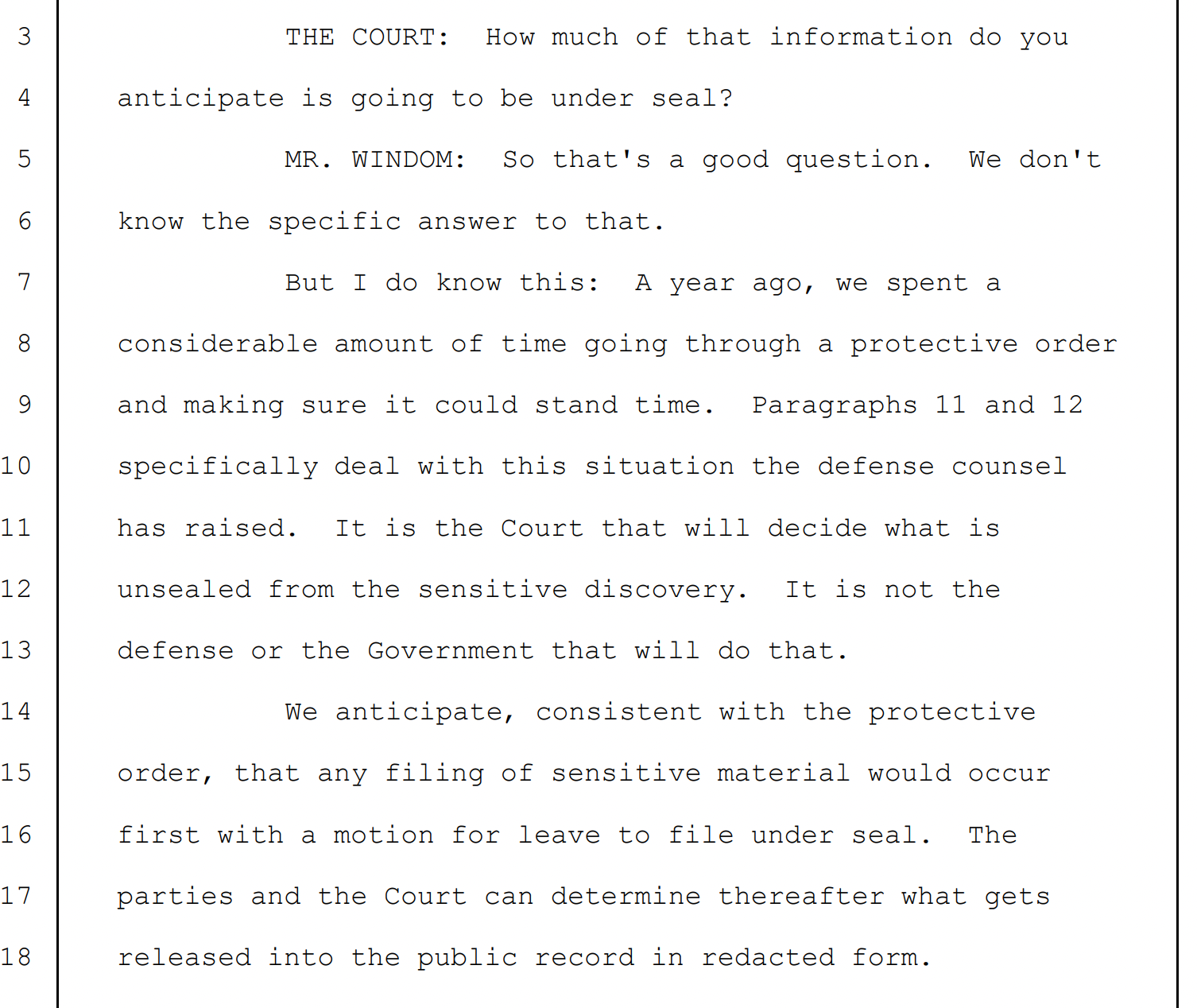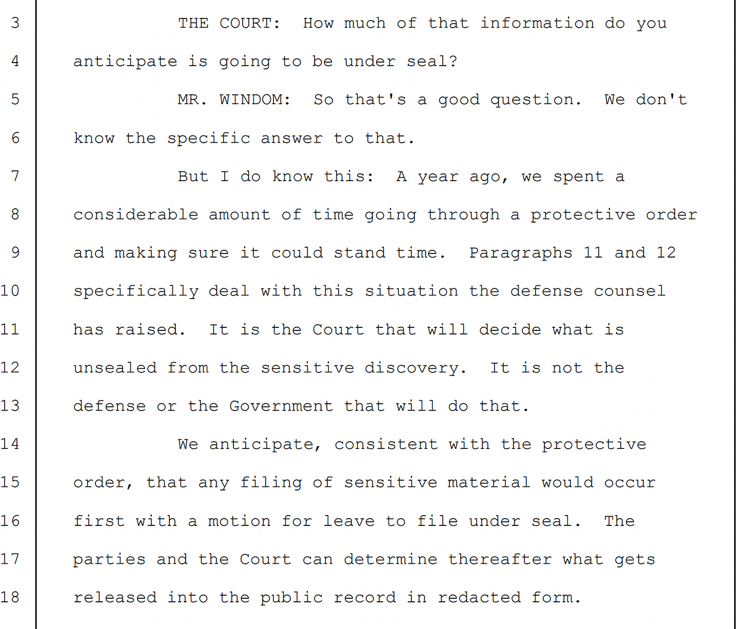But before you get too excited, it’s likely that some, if not all, of the information will remain sealed, filed pursuant to the protective order in this case. Expect the government to ask for permission to file under seal with proposed redactions for public filing. Thomas Windom, one of the prosecutors, confirmed this would likely be their approach.