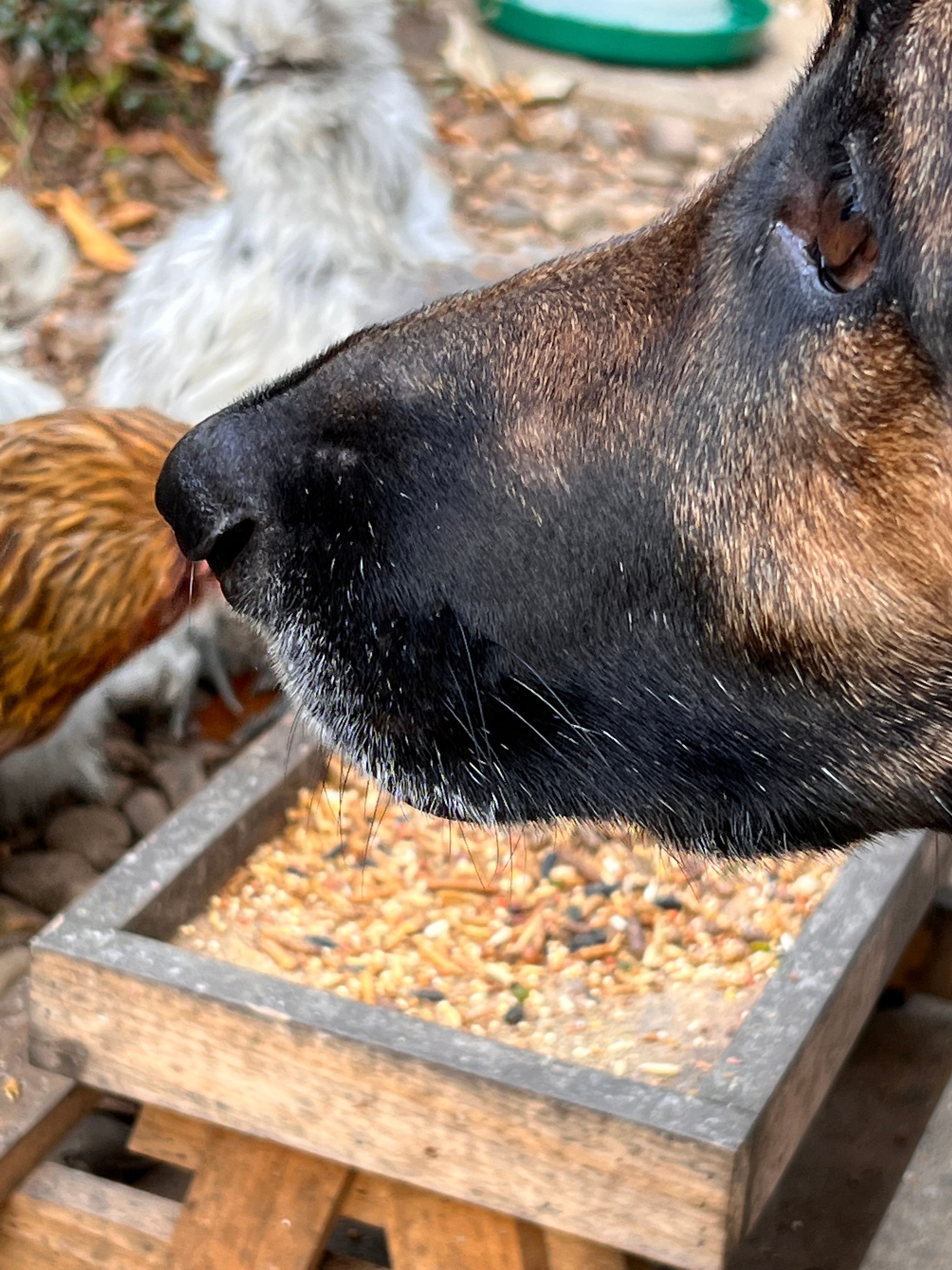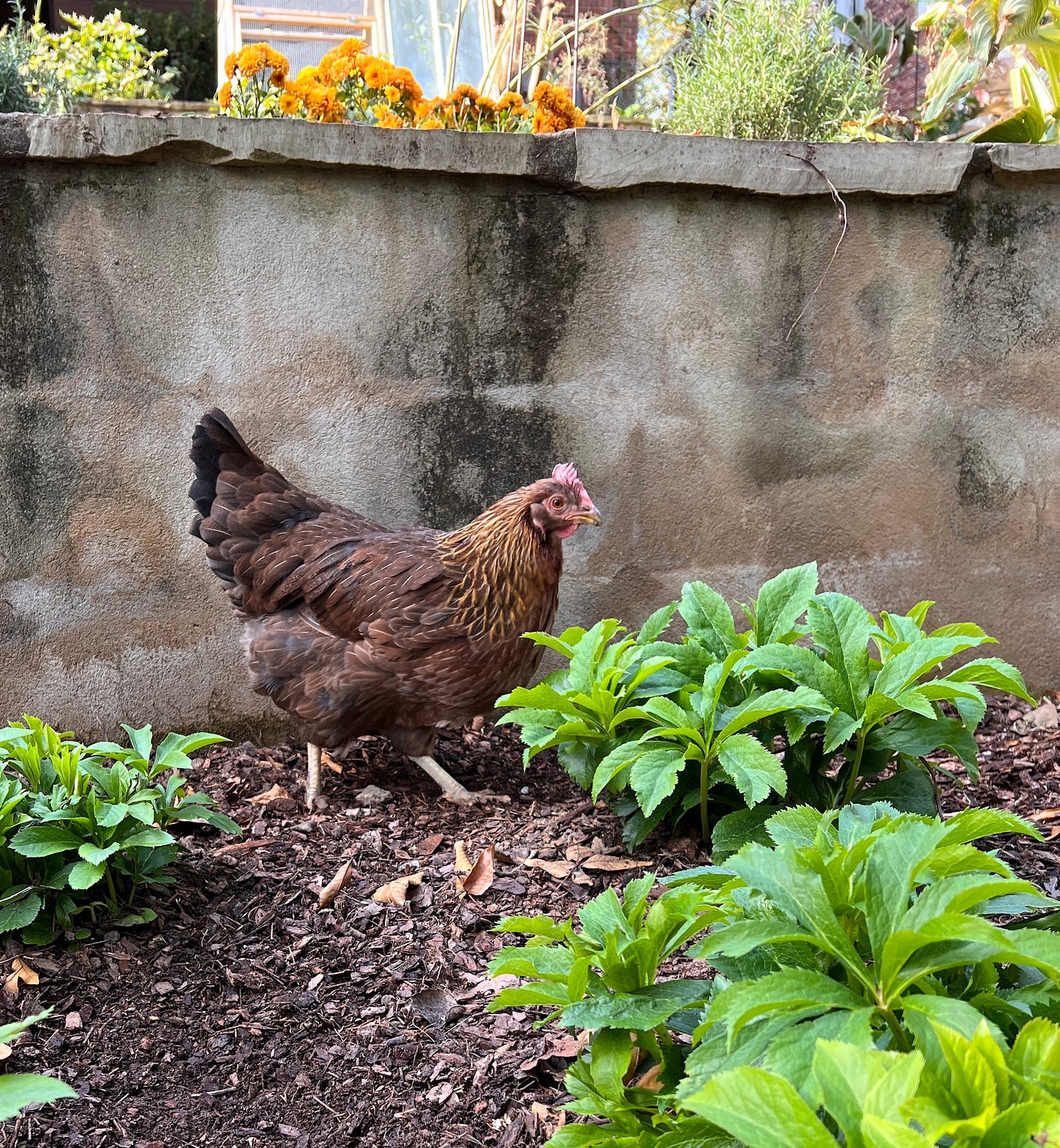 Bella, my German Shepherd, was incredibly watchful as the babies romped around the yard and imitating the big chickens’ scratching. She always tickles me when she plays guard dog. And although I’d intended to get some serious research and writing done, before our human chicks come home for the holiday, I let most of the day slip away doing nothing more meaningful that cutting back a plant here and there and sitting down for a serious chat with a chicken now and then.