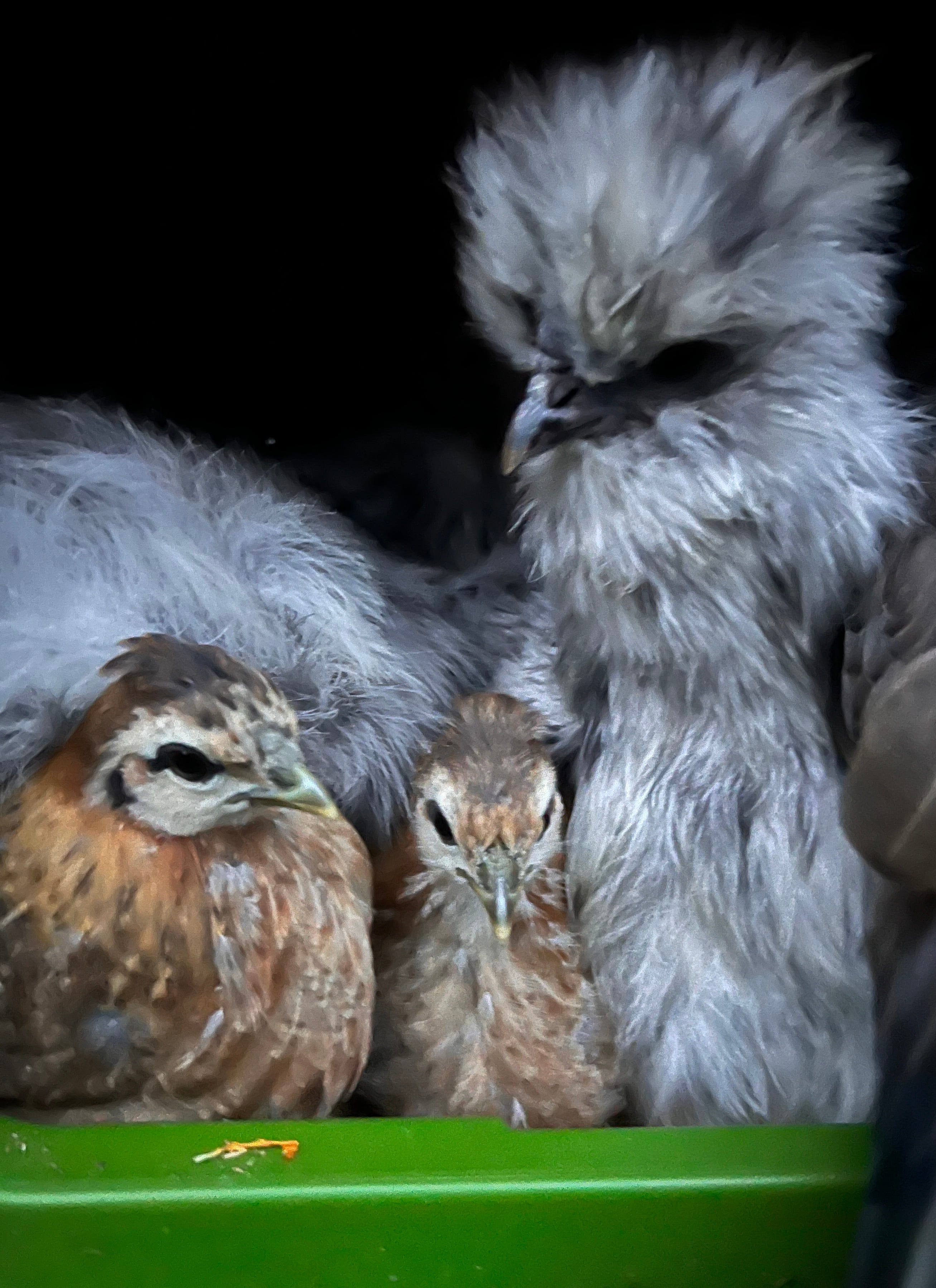 I had good intentions today. I planned to get a lot of work done. And, I did, in a way. I cleaned the chicken coops from top to bottom and reorganized my shed, which was, of course, just an excuse for spending hours outdoors on a beautiful, brisk winter day. The newest baby chicks, Cleo & Florence (below, ready for bed with one of their moms), had their first full day of running around in the yard and free ranging. They really enjoyed themselves.