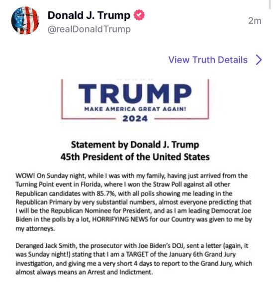 The hope is that Jack Smith is ready to follow up. It looks like he is. Today, the former president took to social media to announce that he had received a target letter from the Special Counsel (on a Sunday night of all things—Trump has clearly underestimated the work ethic of federal prosecutors).