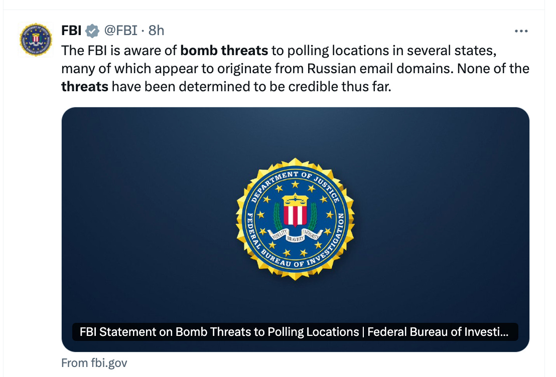 While we all continue to watch the votes come in and worry about the ultimate result, I want to make sure you were aware of a really disturbing development: the plethora of bomb threats at polling places that broke out today.