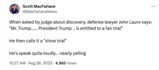 Tuesday, Mark Meadows, a surprise witness at his own removal hearing in Georgia will continue to make his case for a trial in federal court instead of state court. Next week, Trump and his co-defendants in the Fulton County case will be arraigned. We are living in the moment where the courts—and prosecutors—are relentlessly pursuing their cases. The rule of law, which Trump tried so badly to break, is still working.