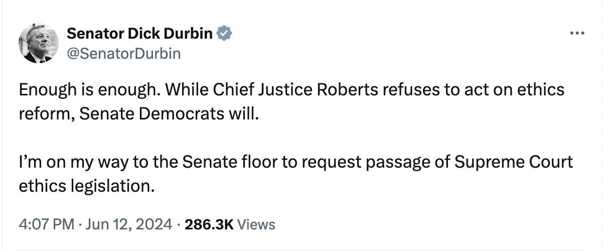 Even though unsuccessful, today’s work in the Senate was important work. It’s a good start. Sometimes, you’ve got to build a runway before you can take off. Senator Durbin, in particular, blamed Republicans who blocked the SCERT Act from clearing the Senate in pointed terms any voter can understand. “They’d rather have a Supreme Court riddled with ethical lapses than institute a binding code that applies to every justice.” he wrote on Twitter. He also tweeted, “Chief Justice Roberts repeatedly refuses to use his authority and power to implement a binding code of conduct for the Supreme Court. Until he does, Congress will continue our legislative efforts.”