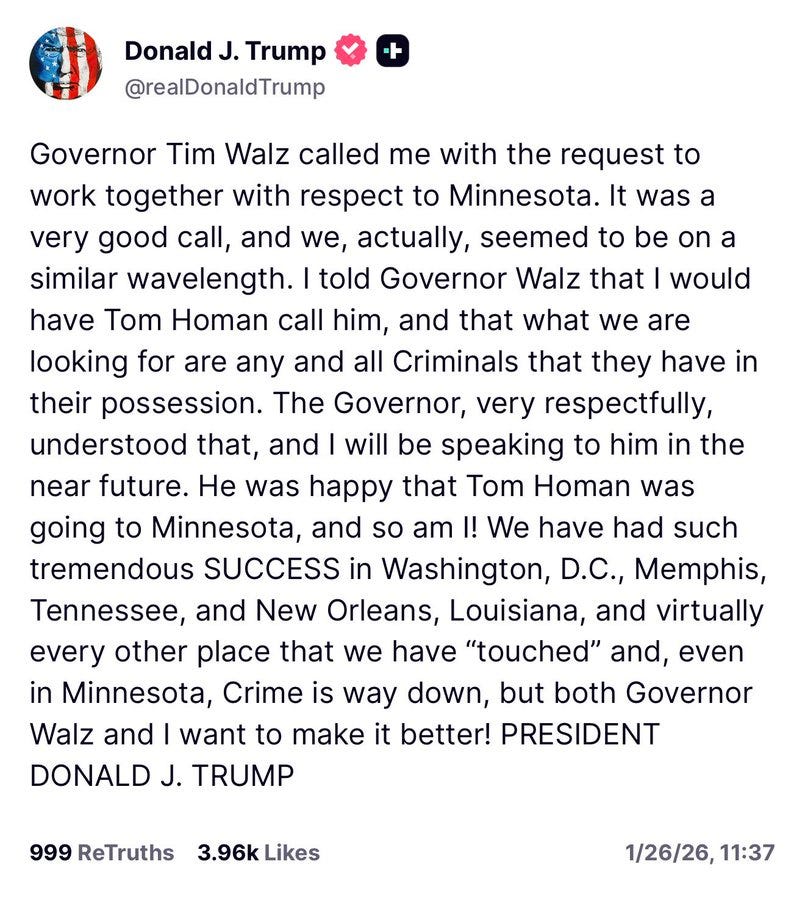 Monday around noon Eastern Time, The Guardian’s Hugo Lowell tweeted that “Trump appears to seek an off ramp amid widening public backlash against the immigration operation in Minnesota and this weekend’s killing. The admin could also face further setbacks as soon as today if the courts find that Operation Metro Surge has been broadly illegal.” He attached the following Truth Social post made by Trump, one that beats a hasty retreat from Trump’s recent attacks on Minnesota Governor Tim Walz. He wrote, almost unimaginably, about working with Governor Walz.