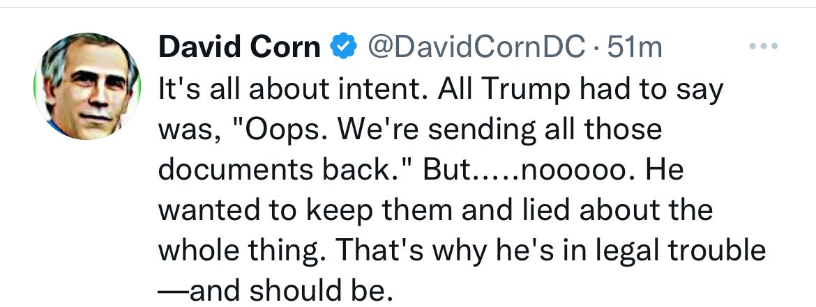 The situation with Pence, as with Biden, casts Trump’s criminality into sharper focus by contrast. David Corn summed it up in a tweet.
