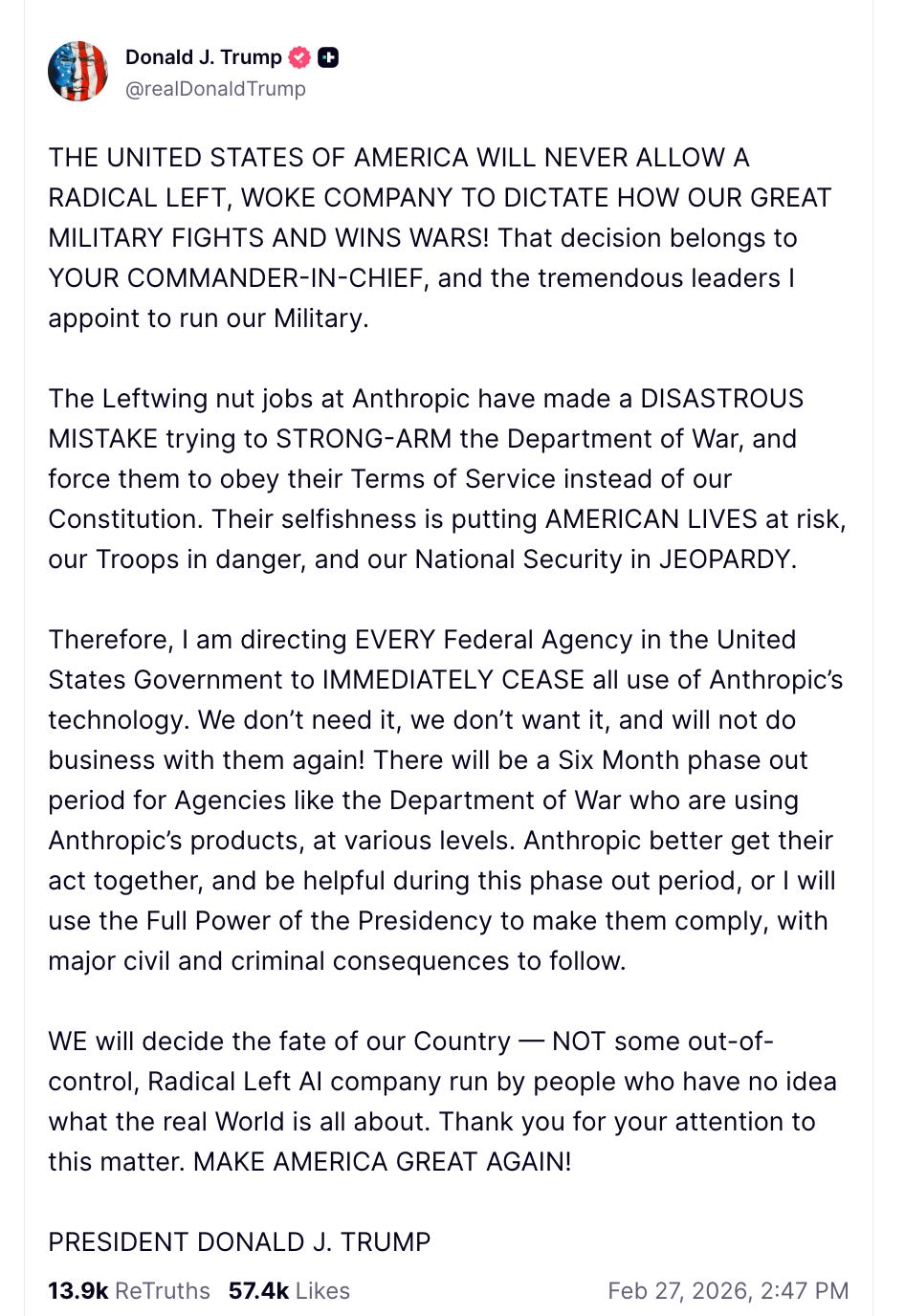 And so, represented by one of the law firms Trump feared enough to try to put them out of business with an executive order, Anthropic headed into court. A lawsuit in the Northern District of California asks the Judge to reverse the Pentagon’s designation of the company as a “supply chain risk,” which essentially puts them on a blacklist that prevents other companies from doing business with them if they want to continue working with government agencies. A second lawsuit was filed directly with the federal court of appeals in Washington, D.C.