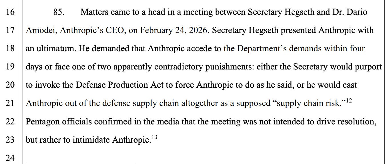 Anthropic notes the heavy-handed tactics used by DOD in its complaint, as in this paragraph: