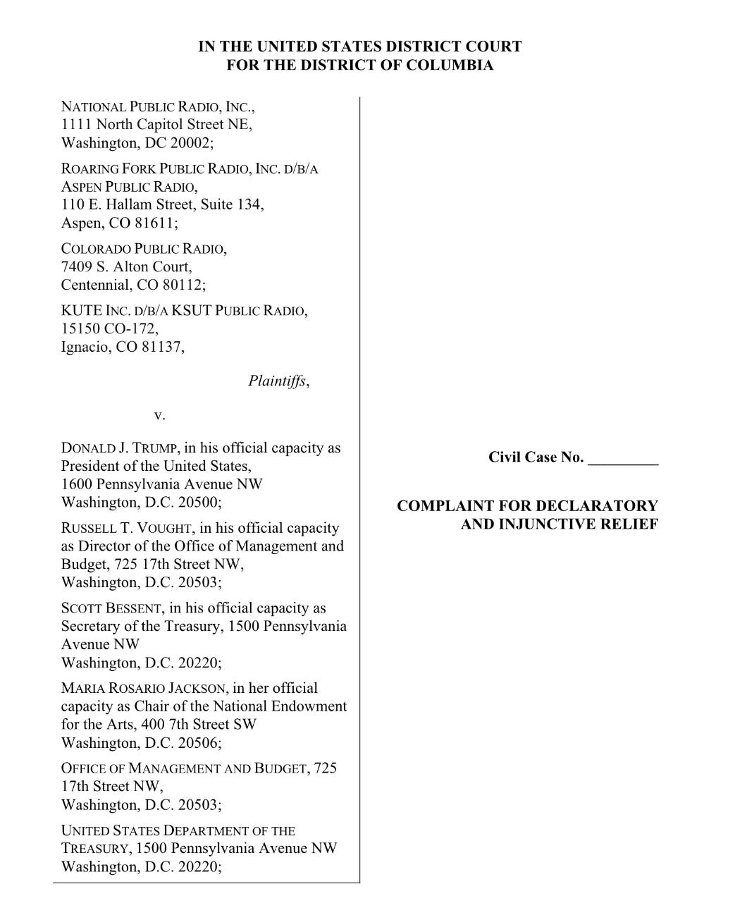 The order has already impacted operations. One day after it was signed, the National Endowment for the Arts (NEA) withdrew a grant from NPR. The complaint alleges that the EO puts NPR and its member stations on notice that if the government disapproves of editorial choices, it will exercise as much power as it can claim for itself to retaliate for the programming they air.