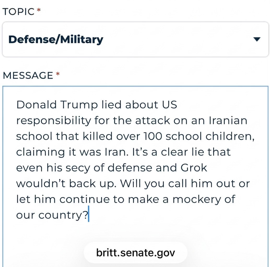 I’m sure I’ll get a response in a week or so, thanking me for sharing my views and saying nothing of substance, committing to do nothing of substance. But we know their offices keep track of communications on a topic. That’s how we ended up with the Epstein Files Transparency Act, because people like you and me wrote and called and demanded justice. We need to mount a sustained campaign here too, this time to find out what the truth is and to publicly acknowledge it, because we cannot become a country that kills school kids and lies about it.