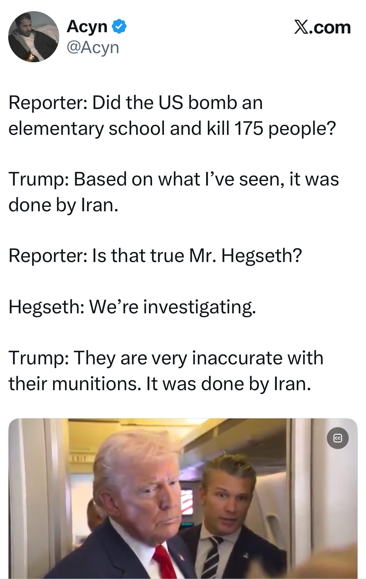 But we can all condemn an attack on a school—and a president who lies about his responsibility for it. In fact, we have to, if we don’t want to become a country that kills people at will. What happened in Iran should terrify Americans because of what it means if we don’t face it. And that is especially true as the administration warehouses immigrants in this country and we hear stories of people dying in those places from lack of medical care and even homicide. There is great danger in moments like this, and that is precisely why we need to make sure we don’t let this go.