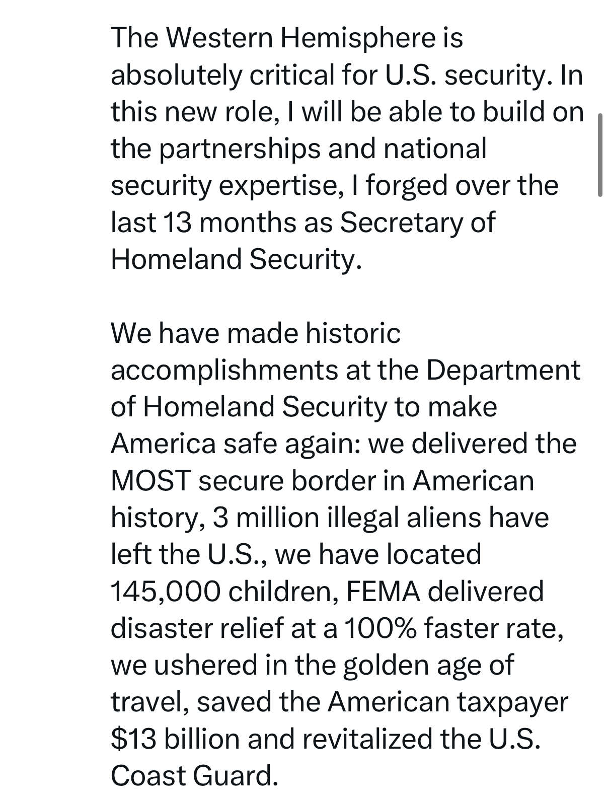 The Tweet goes on for a really long time and convinces me Twitter needs to restore character limits, even for fancy Blue Check Cabinet Secretaries—maybe especially them. Before she’s done, we learn that she has learned that the Western Hemisphere is absolutely critical for U.S. security. Kudos to her for figuring that out.