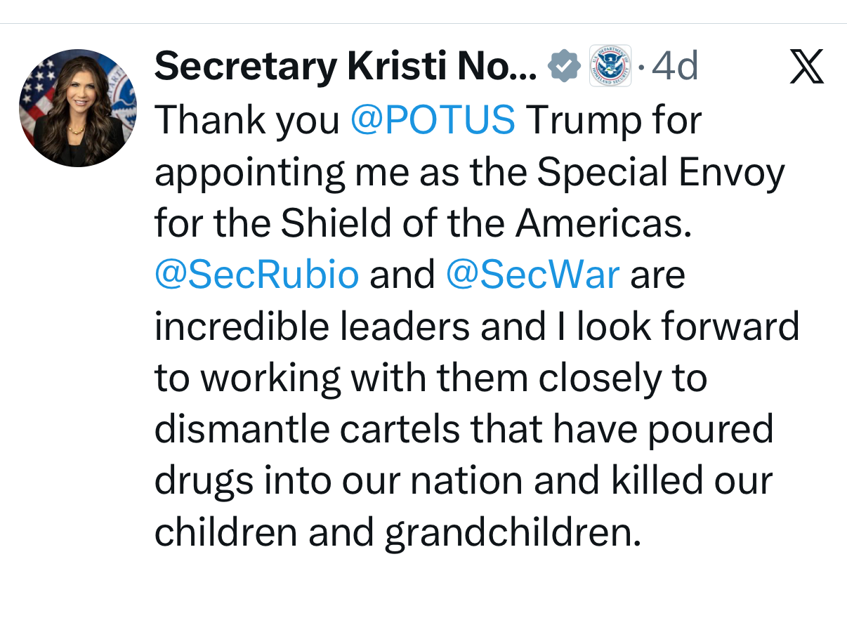 Like Kristi Noem’s last tweet as DHS Secretary. The one where she thanked Donald Trump for appointing her to be “the Special Envoy for the Shield of the Americas.” Some folks would have been upset to be fired while they were in the middle of speaking publicly about their future plans in the position. But not Kristi. She’s apparently made her peace with becoming an underling to. Rubio and Hegseth.