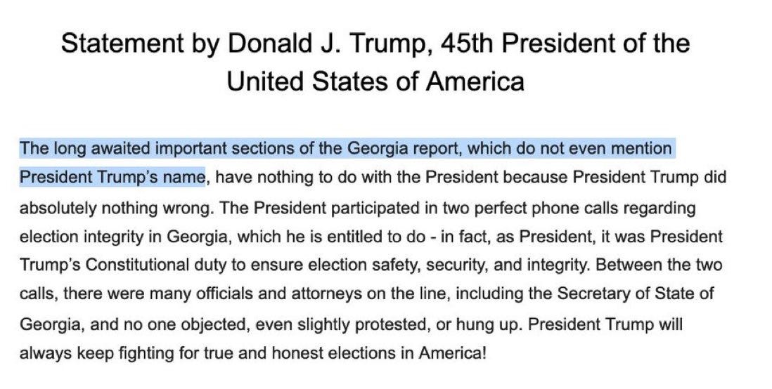 Trump’s statement following the partial release of the report hints at what he might offer. (Or maybe it’s just a coincidence.) He wrote, “The President participated in two perfect phone calls regarding election integrity in Georgia, which he is entitled to do—in fact, as President, it was President Trump’s Constitutional duty to ensure election safety, security, and integrity. Between the two calls, there were many officials and attorneys on the line, including the Secretary of State of Georgia, and no one objected, even slightly protested, or hung up. President Trump will always keep fighting for true and honest elections in America!”