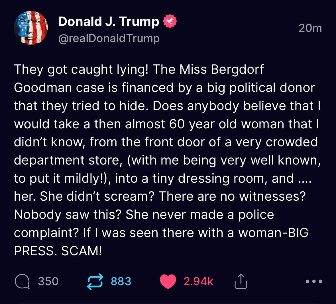 Before the testimony started this morning, Carroll’s lawyer advised the judge that defendant Trump, who has not been in and is not expected to show up in the courtroom, took to social media to tell his story in a venue that did not require him to testify under oath. He resorted to predictable name calling and seemed unable to do the math on Carroll’s age at the time he allegedly raped her.