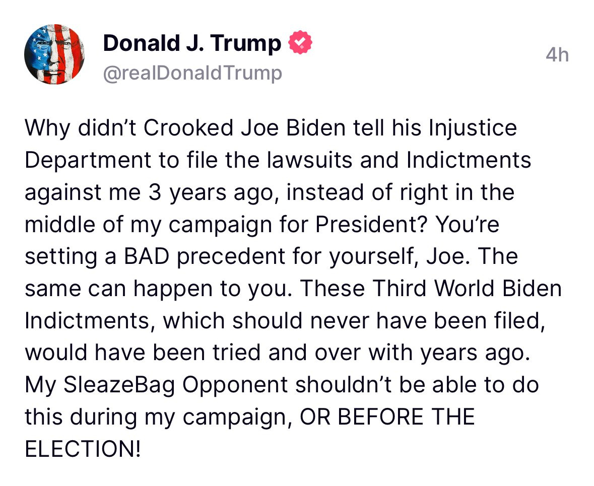 Here is what Trump posted on social media after Judge Chutkan reimposed the gag order in the District of Columbia case. Trump threatened Biden with prosecution, should he win again.