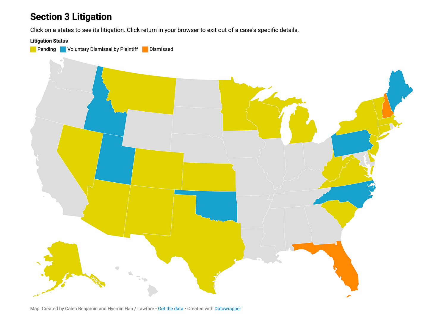 Lawfare has created a tracker that lets you see the status of every case and get information on the proceedings. It’s a fantastic tool that you’ll find here. They write, “Beginning with a case in Florida in February 2023, voters and advocacy groups have brought many Section 3 challenges in state and federal courts across the country, attempting to block Trump’s name from appearing on ballots for state primaries and caucuses before the national election begins. This page is intended to track which states have active Section 3 litigation to remove Trump from the 2024 ballot. At the bottom is a selected reading of Lawfare's coverage on the issue. Note that the procedural posture and legal theories behind these challenges vary greatly, and a dismissal in any particular action does not necessarily bar other challenges from being brought in that same state.”