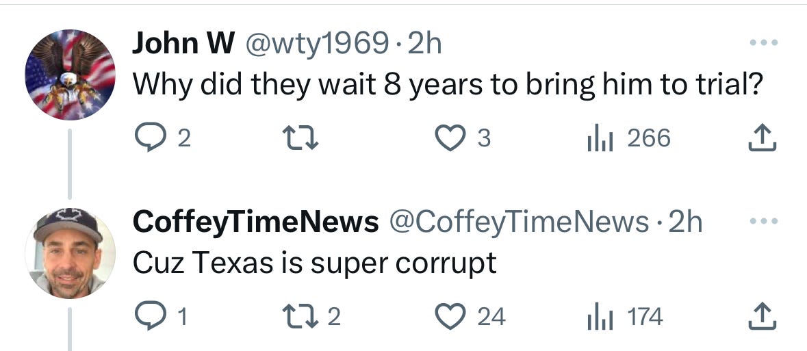 Eight years of delay, closer to nine by the time the case goes to trial, is a real miscarriage of justice. There were certainly some legitimate delays incurred by motions Paxton filed over issues like where in the state the case could be tried, but the snark in this exchange on X was satisfying: