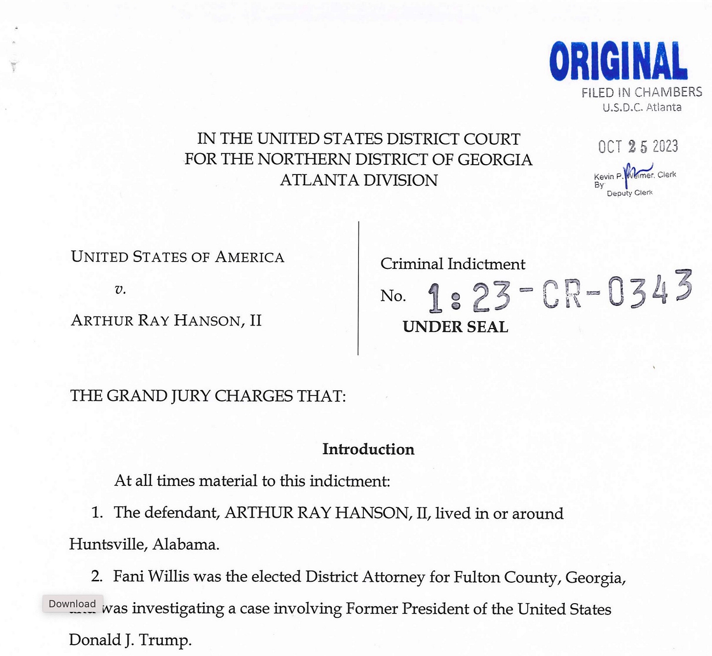 Third and last for tonight is the prosecution of a Huntsville, Alabama, man that commenced in the Northern District of Georgia last week. Arthur Ray Hanson, II, was indicted for making threats against Fulton County District Attorney Fani Willis and Fulton County Sheriff Patrick Labat on account of their prosecution of Donald Trump. Hanson had an initial appearance in Huntsville and will be arraigned in Atlanta on November 13, 2023.