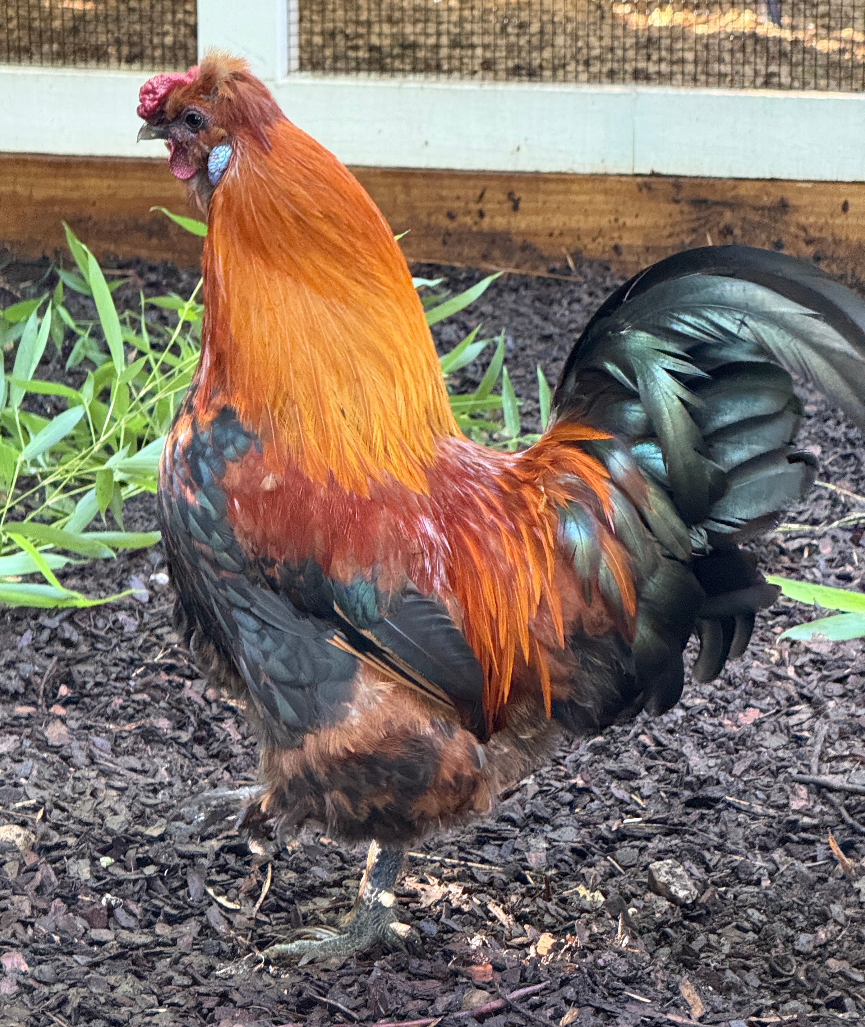 Red is one of the prettiest chickens I’ve ever seen, even when shaggy from molting. Most chickens look horrible in the middle of a molt, but not Red. I love the tail feathers that are so black that they’re green.