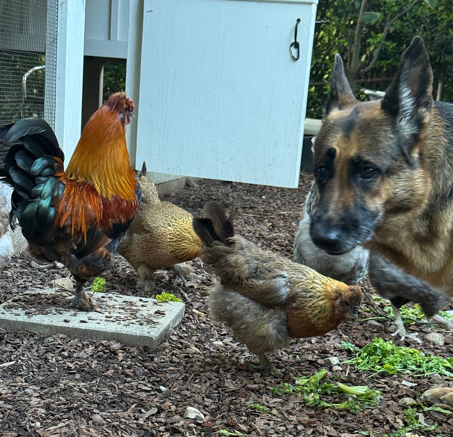 Bella, our German Shepherd, continues to think she is the guardian of the chicken flock, which is a very good thing, because we have hawks and the occasional owl. But she makes me laugh when she shares their morning dose of fresh herbs from the garden.