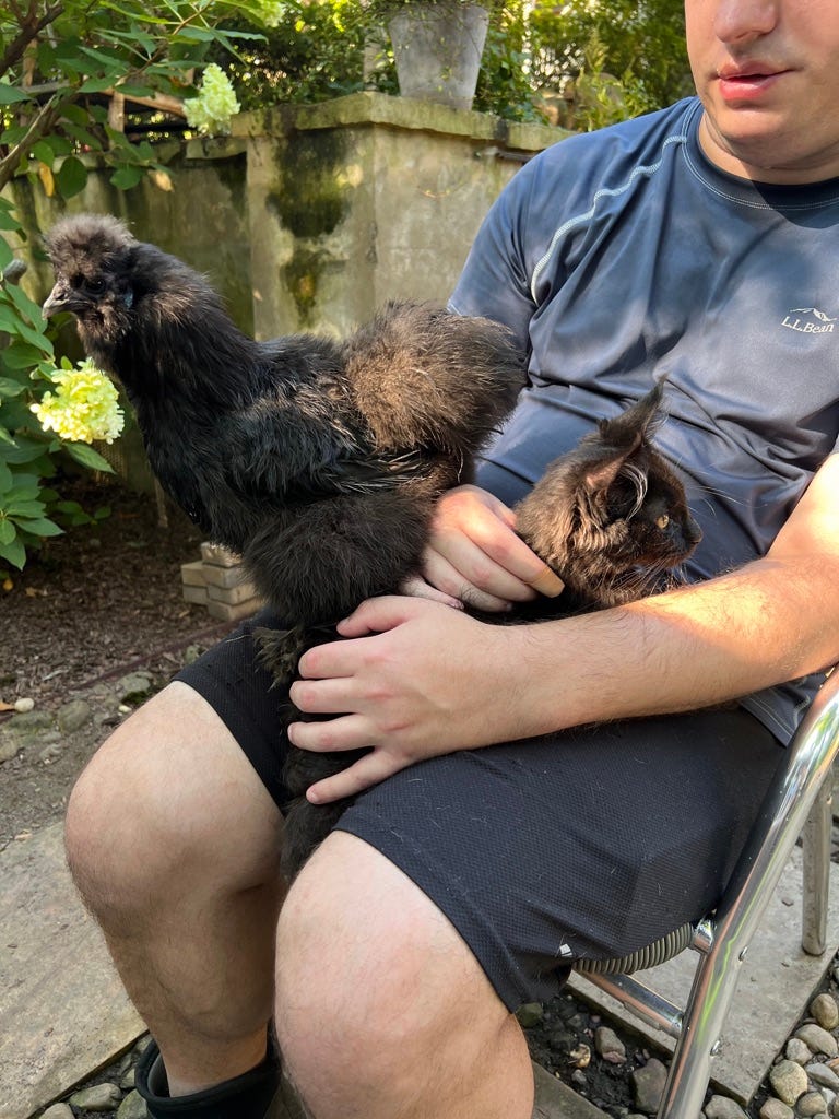 I’ll be checking in with you as soon as we have indictments or other important details. Until then, I’ll leave you with this adorable picture of one of our kids helping the new kitten, Tofu, make friends with the chickens.