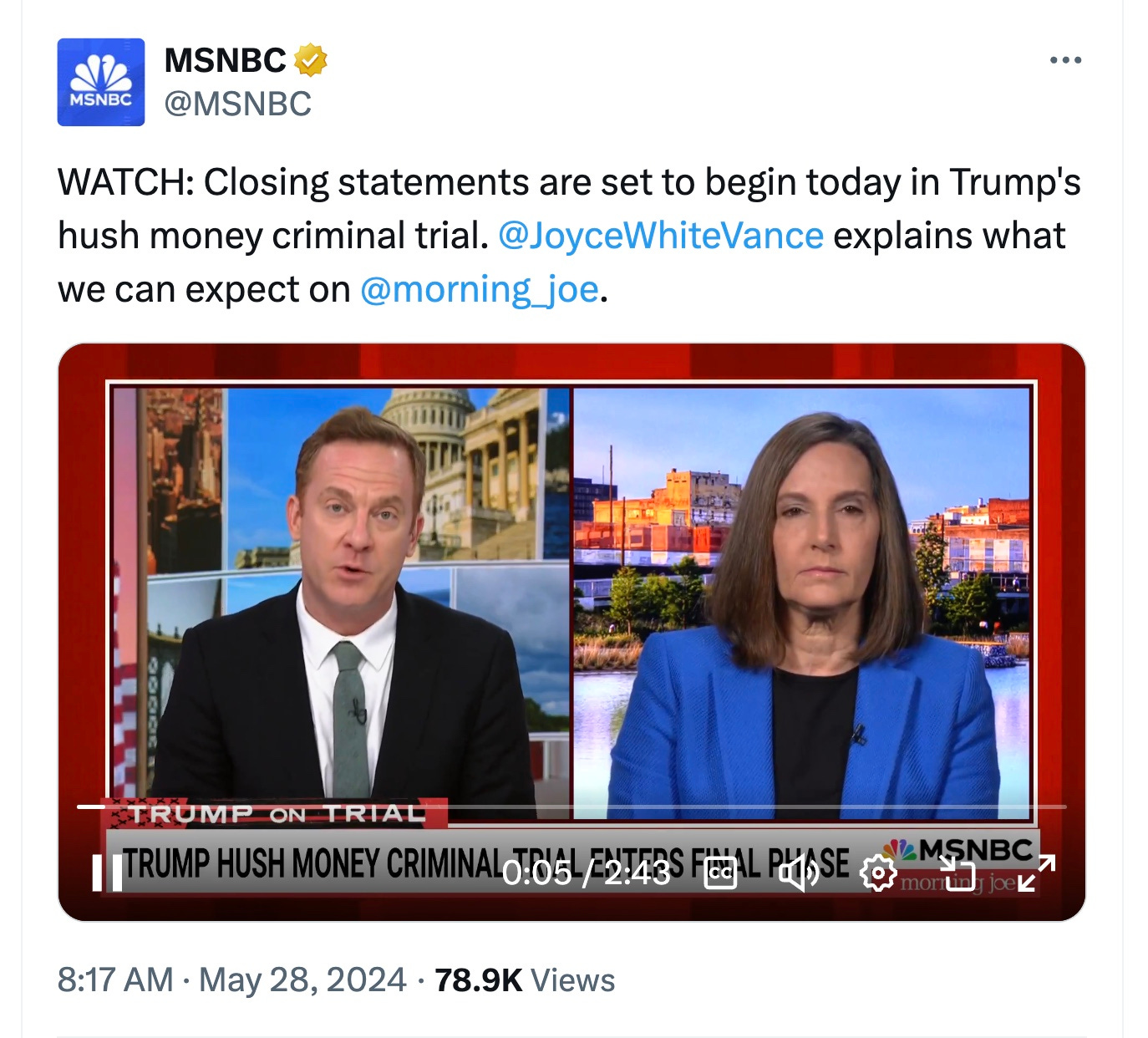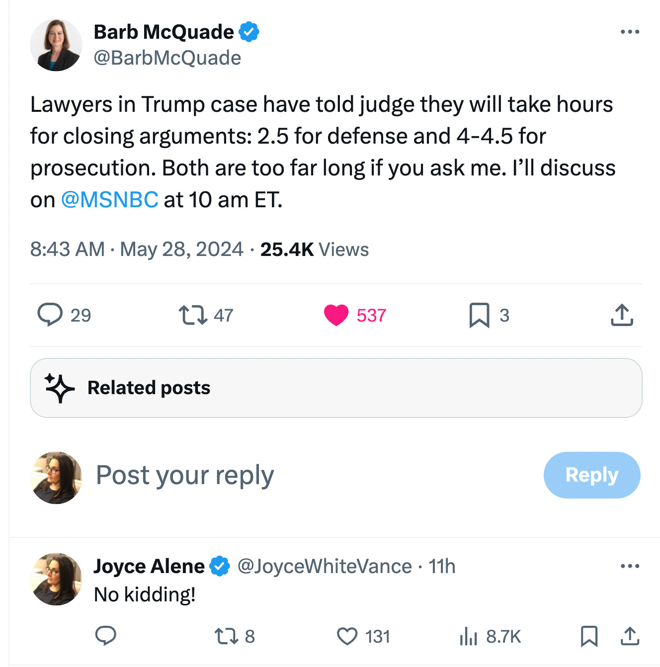 But it likely comes down to this: Trump lawyer Todd Blanche told jurors today that they should want and expect more than Michael Cohen. Prosecutor Joshua Steinglass told them that was what they gave them. Now it’s about to be up to the jury. The verdict in the criminal case is their job. Whatever they decide, our job continues to be looking ahead to November. We have an election to win and a terminally unsuitable candidate to keep out of office.