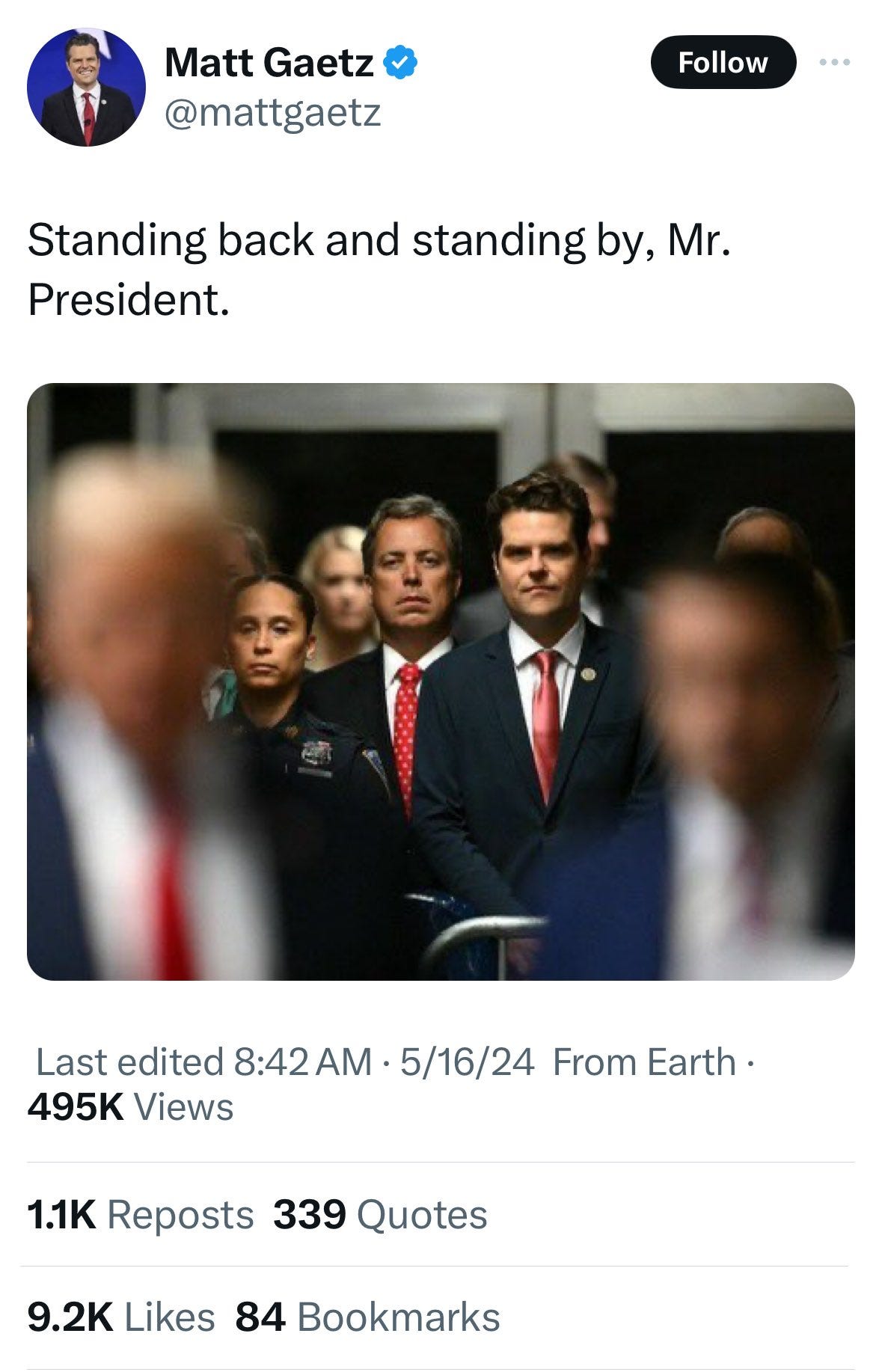 Trump was joined yesterday by Representatives Lauren Boebert and Matt Gaetz. Gaetz, with apparently no sense of irony tweeted: “Standing back and standing by, Mr. President,” in an echo of Trump’s presidential debate shout out to the Proud Boys ahead of the 2020 election. Proud Boys leader Enrique Tarrio was convicted of seditious conspiracy in connection with January 6 and sentenced to 22 years in prison.