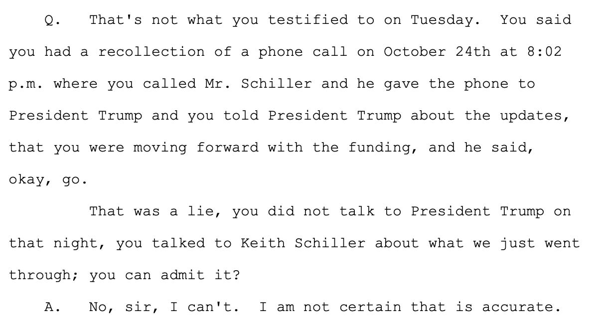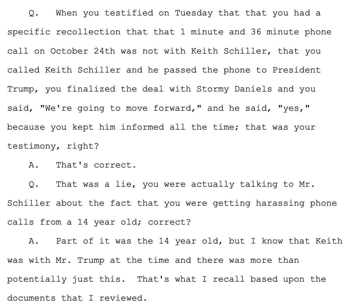 Blanche accused Cohen of lying about the call at this point, trying to get him to concede it was with Schiller about the harassing calls, not with Trump about Stormy Daniels.