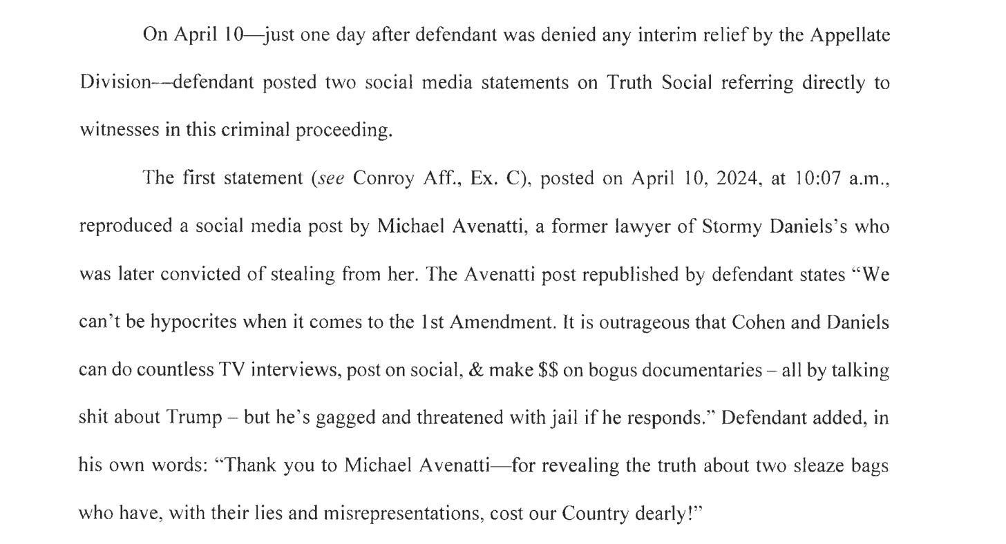 Nonetheless, the Judge did not find Trump in contempt on the first allegation raised by the People, which involved a post on Truth Social on April 10, at 10:07 a.m. He found that the People failed to meet their burden of establishing the violation in regard to only this one of the nine charges. Prosecutors described the post in their motion as a repost of a post by Michael Avenatti, disgraced former lawyer and convicted felon, attacking Michael Cohen and Stormy Daniels. Trump added his own comment thanking Avenatti for “revealing the truth about two sleaze bags who have, with their lies and misrepresentations, cost our Country dearly!”