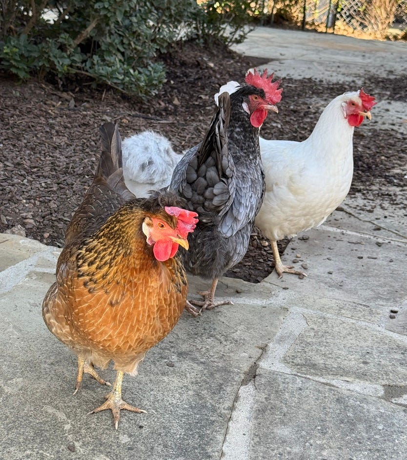 The chickens aren’t entirely certain about what’s going on here. She seems to love chasing after them but has quickly picked up the cues from Bella, and Tofu, our Maine Coon Cat, that these are friends.