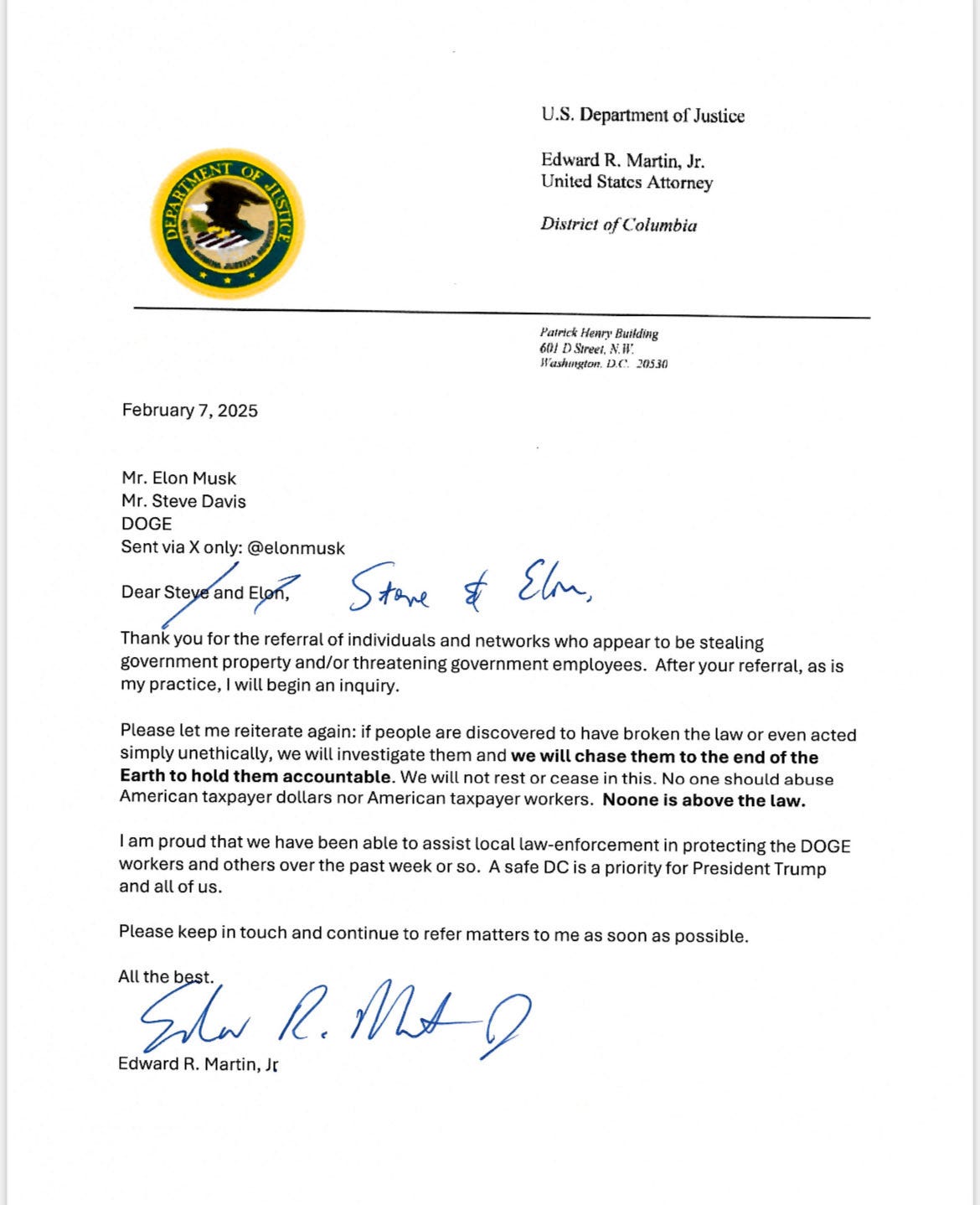Then there is Ed Martin, Trump’s interim U.S. Attorney in the District of Columbia. He was back on Twitter, flirting with Elon Musk in a manner that is inconsistent with the prosecutor’s motto, without fear or favor.