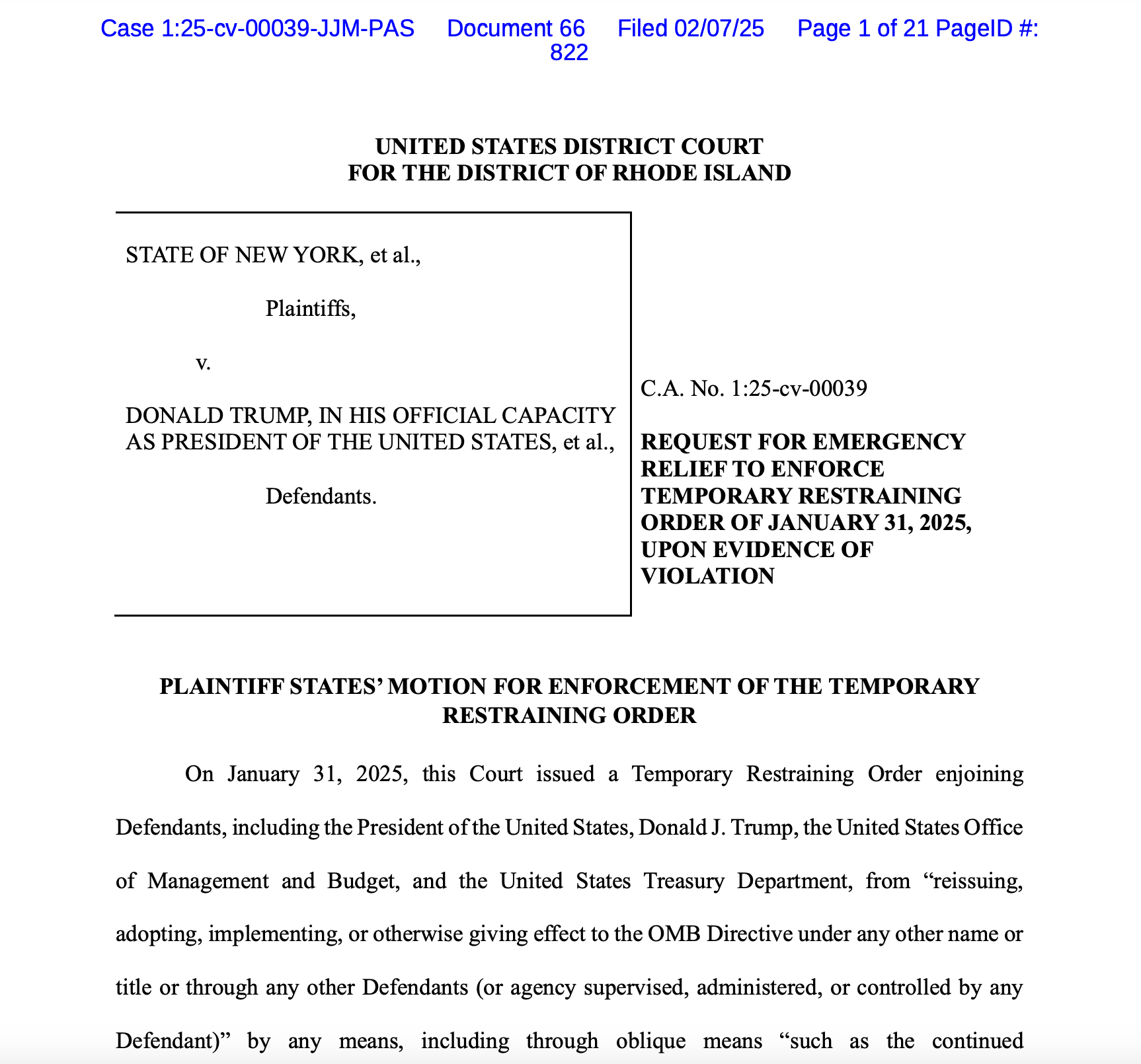In the Rhode Island case brought by 22 states and the District of Columbia, the plaintiffs argue that “there is no world in which these scattershot outages, which as of this writing impact billions of dollars in federal funding across the Plaintiff States, can constitute compliance with this Court’s Order,” and noted the situation had not improved in the week since the court entered its order. They concluded, “This Court should enforce the plain text of its temporary restraining order and order Defendants to immediately restore funds and desist from the federal funding pause until the preliminary injunction motion can be heard and decided, a process which is proceeding expeditiously in separate proceedings before this Court.”