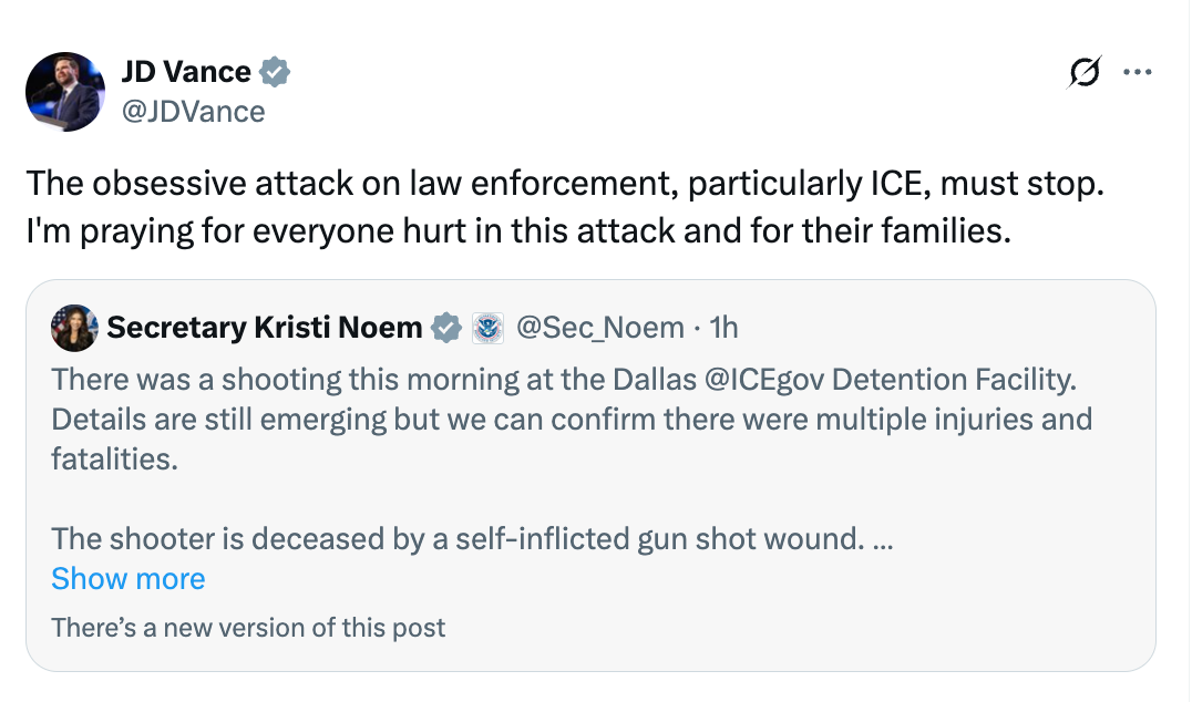 Vice President JD Vance was one of many who jumped to condemn the attack as a crime against ICE, committed by people on the left. But as the day drew on, there was little information about the shooter, who took his own life, and his motives. The government said the bullets were marked with “anti-ICE” slogans. One undocumented person was killed and two other people were shot, but reports indicate none of the people who were targeted were federal agents. Calling it an “obsessive attack on law enforcement” seems to be premature, at best.