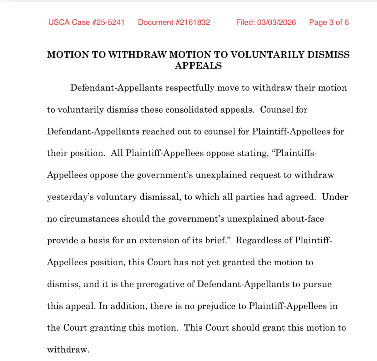 That’s how you get to the cumbersome title of today’s pleading, filed by the Associate Attorney General, the number three official at DOJ, just below the Attorney General and the Deputy Attorney General. This morning, he filed a “Motion To Withdraw Motion To Voluntarily Dismiss Appeals.”
