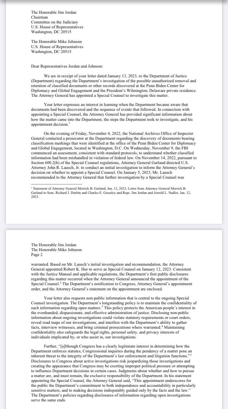 “On January 12, 2023, you appointed Robert Hur as Special Counsel to investigate these matters,” they wrote. “The circumstances of this appointment raise fundamental oversight questions that the Committee routinely examines. We expect your complete cooperation with our inquiry.”