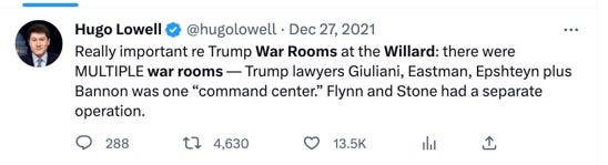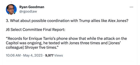 Or at least, no seditious conspiracy. But that’s not the only option at prosecutors’ disposal. The Proud Boys case also included an obstruction of government proceedings charge, based on interference with the certification of the electoral college vote. That kind of charge has always seemed more probable where Trump was concerned, particularly as the evidence mounted that he knew he lost the election, and knew that the “fake slates of electors/get Mike Pence on board” strategy wasn’t lawful. Trump was surrounded by a band of people who appear to have been working together to obstruct result of the election. It’s unlikely the Proud Boys would have any insight into that conspiracy, but it’s possible, perhaps likely, they could implicate people who were working with them but who were also part of a separate conspiracy involving that inner circle conduct. For instance, NYU Law Professor Ryan Goodman suggested this possibility: