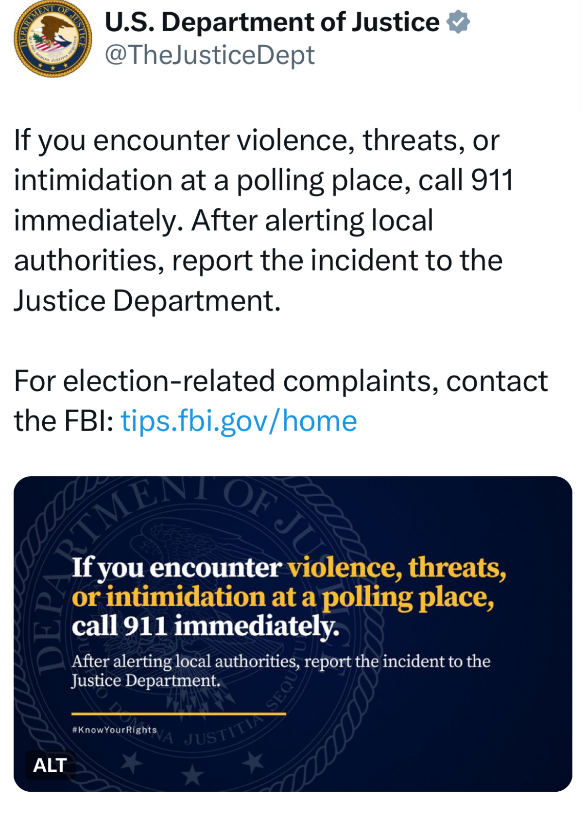 Federal officials continue to be on high alert for the risk of violence at polling places. Again, be cautious as news emerges. There are reports that Russia is circulating disinformation. Wait for confirmation—from credible sources—of anything you hear.