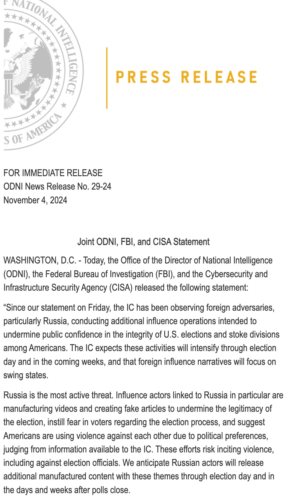 Late Monday, the Office of the Director of National Intelligence, the FBI, and the Cybersecurity and Infrastructure Agency put out a joint bulletin cautioning that Russia and other foreign interests were using disinformation campaigns to undercut Americans’ confidence in the integrity of the election and stoke divisions. They said they expected to see more of this on election day and after.