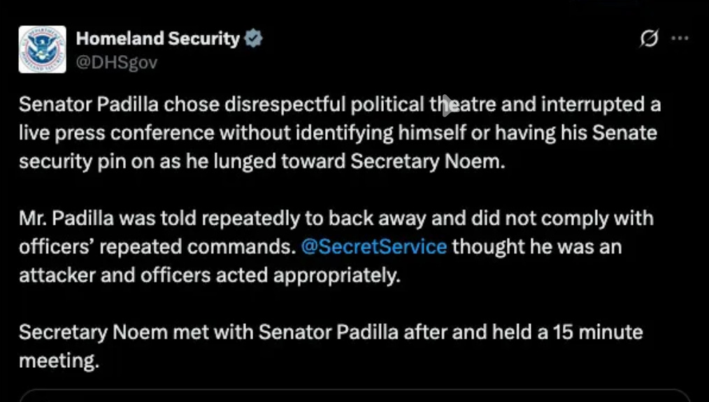 Further back, there was the incident with California Senator Alex Padilla last June. Padilla tried to ask Noem a question during a press conference she was holding in his state. Agents manhandled him to the ground and zip-tied him, as he audibly identified himself. Noem said afterwards on Fox News that Padilla lunged toward the podium where she was speaking and failed to say who he was. That’s a lie too, as video from multiple angles showed. Instead of apologizing, she used an official DHS social media account to criticize the Senator.