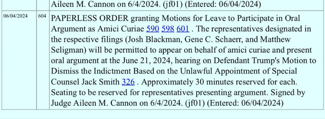 This is another one of those motions Judge Cannon should have denied out of hand. The issue was decided against Trump by the District of Columbia Court of Appeals in a lawsuit brought by a Roger Stone associate who challenged subpoenas issued during the Mueller investigation. Ultimately, Judge Cannon will rule against Trump or face reversal in the Eleventh Circuit Court of Appeals. But by using this highly unusual device of permitting non-parties to argue legal issues in a case before a district court (amicus briefs are more common in courts of appeals and are frequent in the Supreme Court, although the opportunity to argue in person, unless it’s the Solicitor General on behalf of the United States, is still limited) Judge Cannon will buy Trump still more delay.