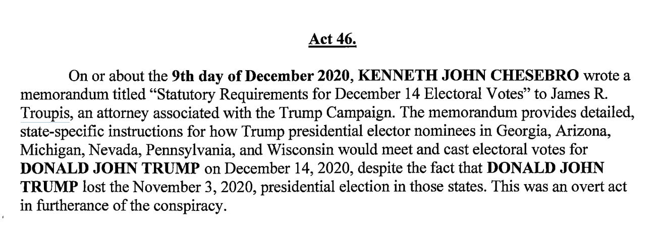 Troupis is also mentioned in Overt Act 46 in connection with a memo, again authored by Chesebro, giving state-specific instructions for the fake elector scheme.